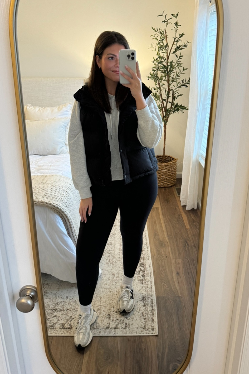 The monochromatic palette creates a sleek, cohesive look, while the puffer vest adds a trendy, layered dimension that is both stylish and practical for transitional weather. The clean lines of the outfit combined with classic sneakers make for a comfortable yet put-together casual ensemble.