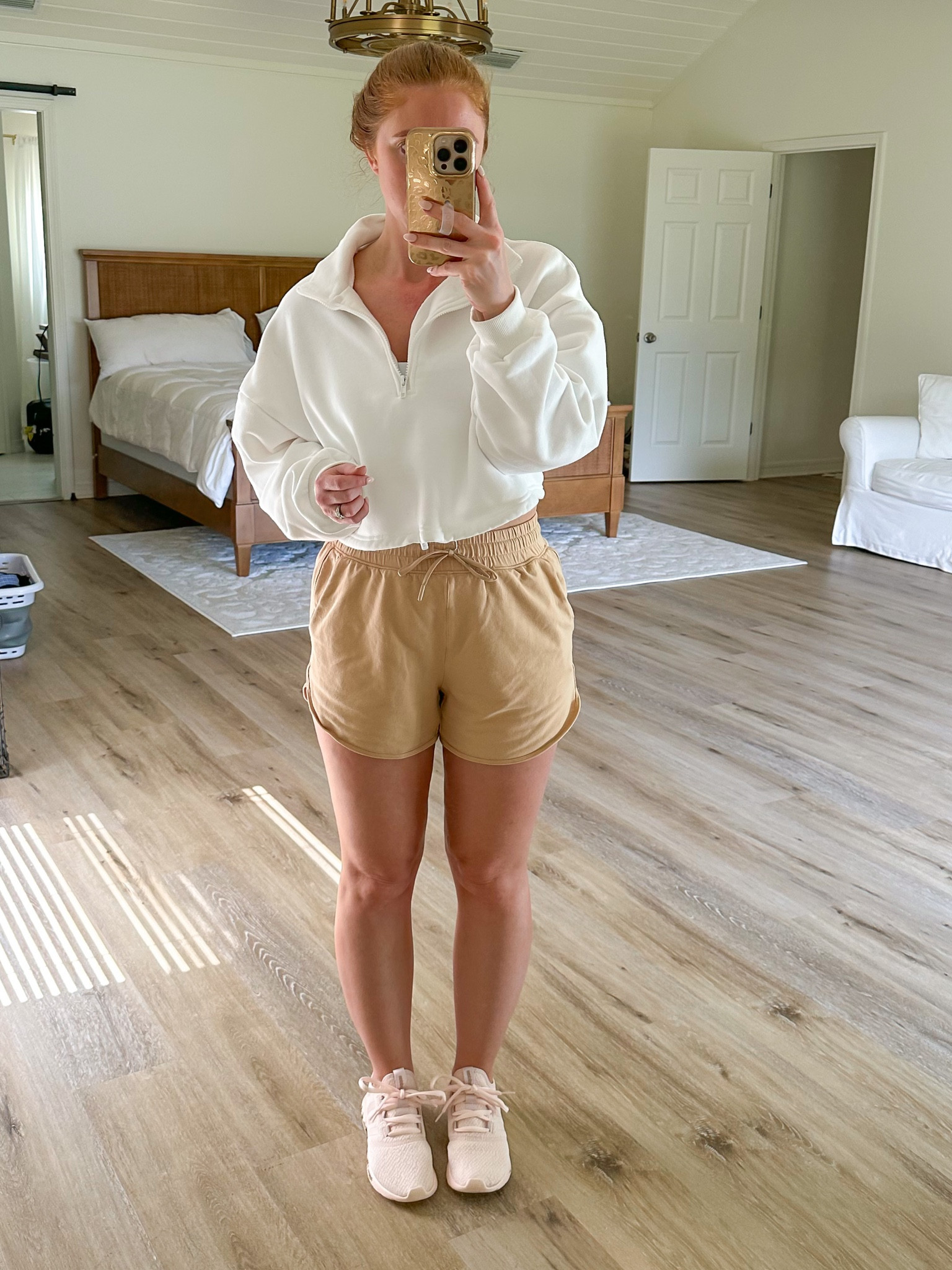 This relaxed ensemble exudes effortless chic with its clean, monochromatic palette which is always on-trend. The loose-fitting but structured white shirt perfectly balances the casual tone of the shorts, while the sneakers add a practical touch for an on-the-go lifestyle.