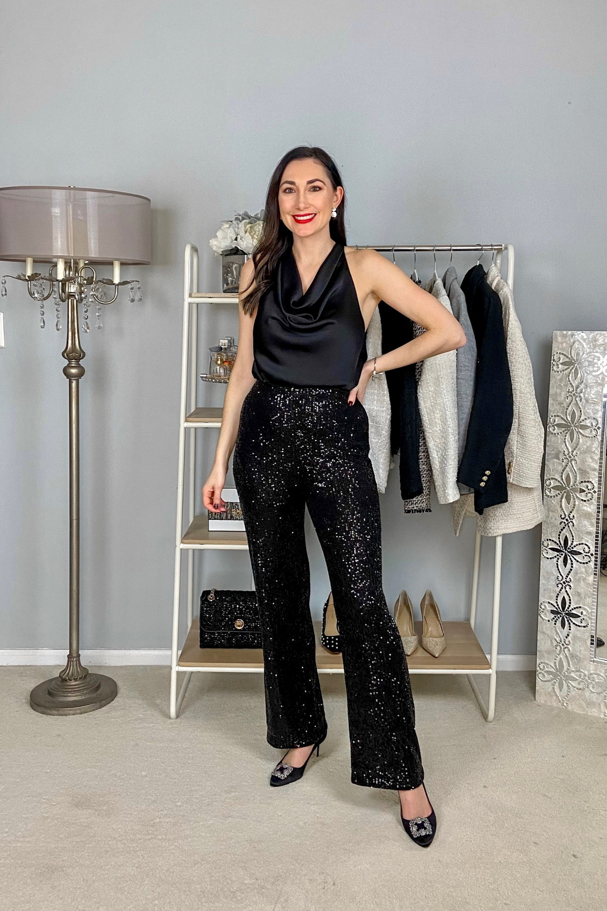 The combination of a fitted, simple top with high-waisted sequined flare pants creates a balanced silhouette that’s both eye-catching and elegant. The monochromatic palette keeps the look cohesive, allowing the texture of sequins to be the standout feature without overwhelming.