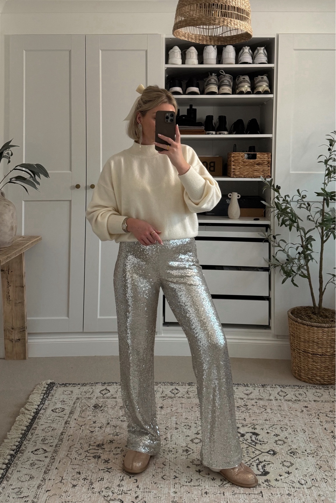 The juxtaposition of a cozy, oversized cream sweater with sparkling silver trousers creates a striking balance between comfort and glam, ideal for a chic yet relaxed aesthetic. The monochromatic palette of the accessories elegantly complements the outfit, enhancing its sophistication.