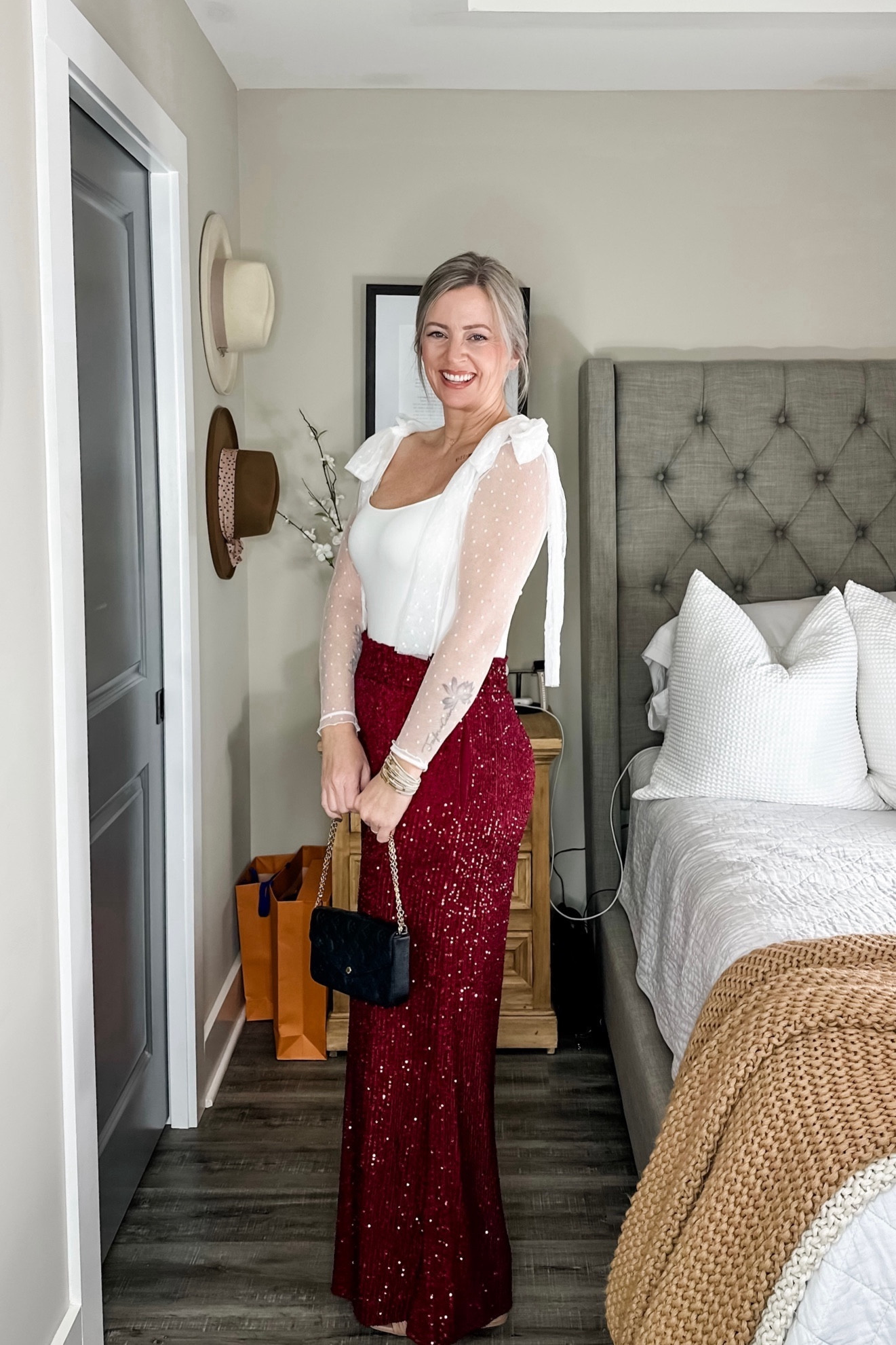 As a fashion expert, I appreciate the outfit’s sophisticated balance—the delicate play of textures between the airy, dotted sheer sleeves and the shimmering red sequin skirt creates a harmonious contrast. Moreover, the choice of a fitted silhouette showcases an elegant figure while the white and red color scheme exudes a classic yet festive charm.