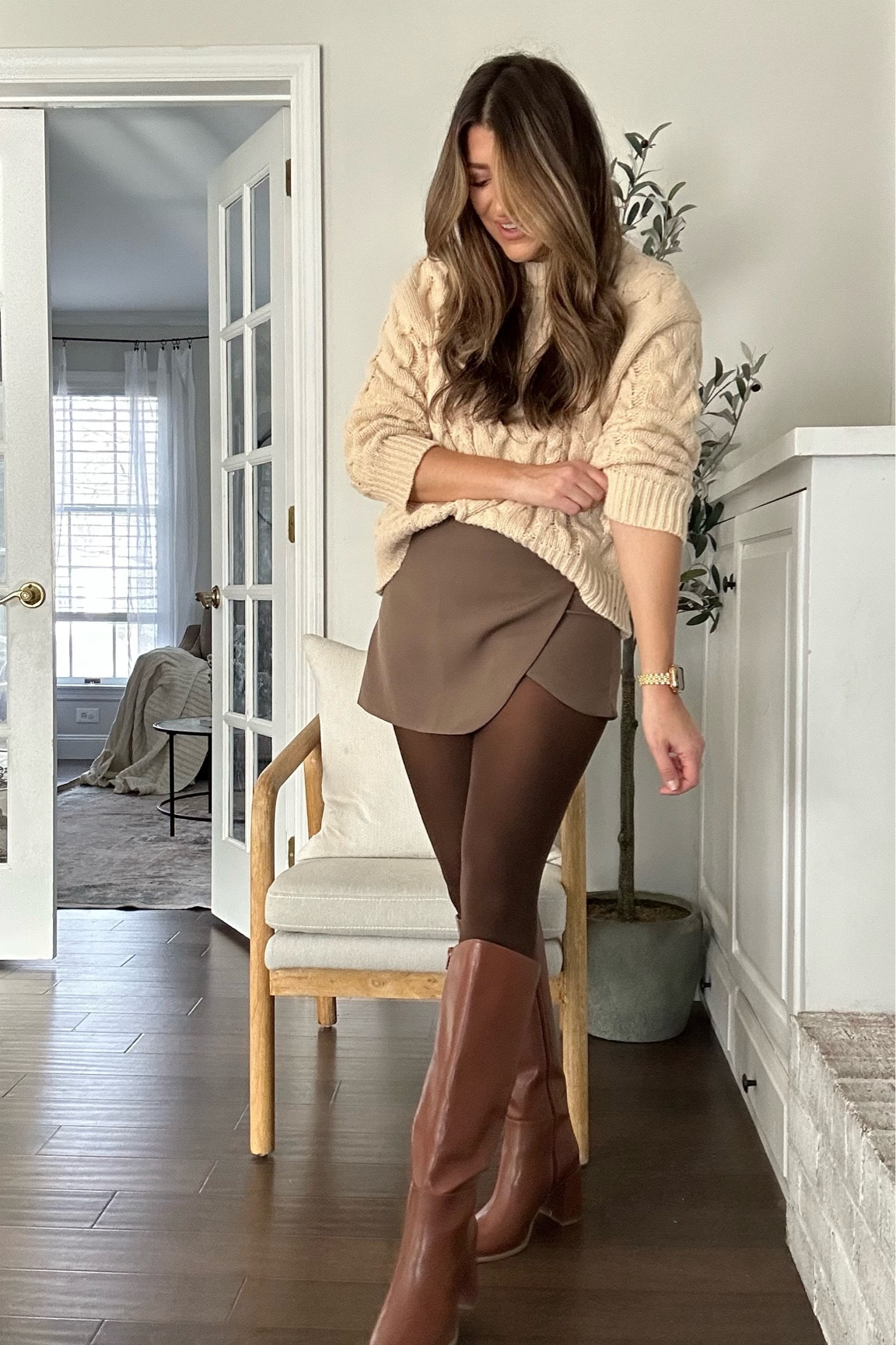 The ensemble masterfully plays with texture, pairing a chunky knit sweater with a smooth, tailored skirt, offering a cozy yet chic aesthetic. The earthy tones are harmoniously matched and complemented by the sleek, knee-high boots, creating an elegant silhouette that is both modern and timeless.