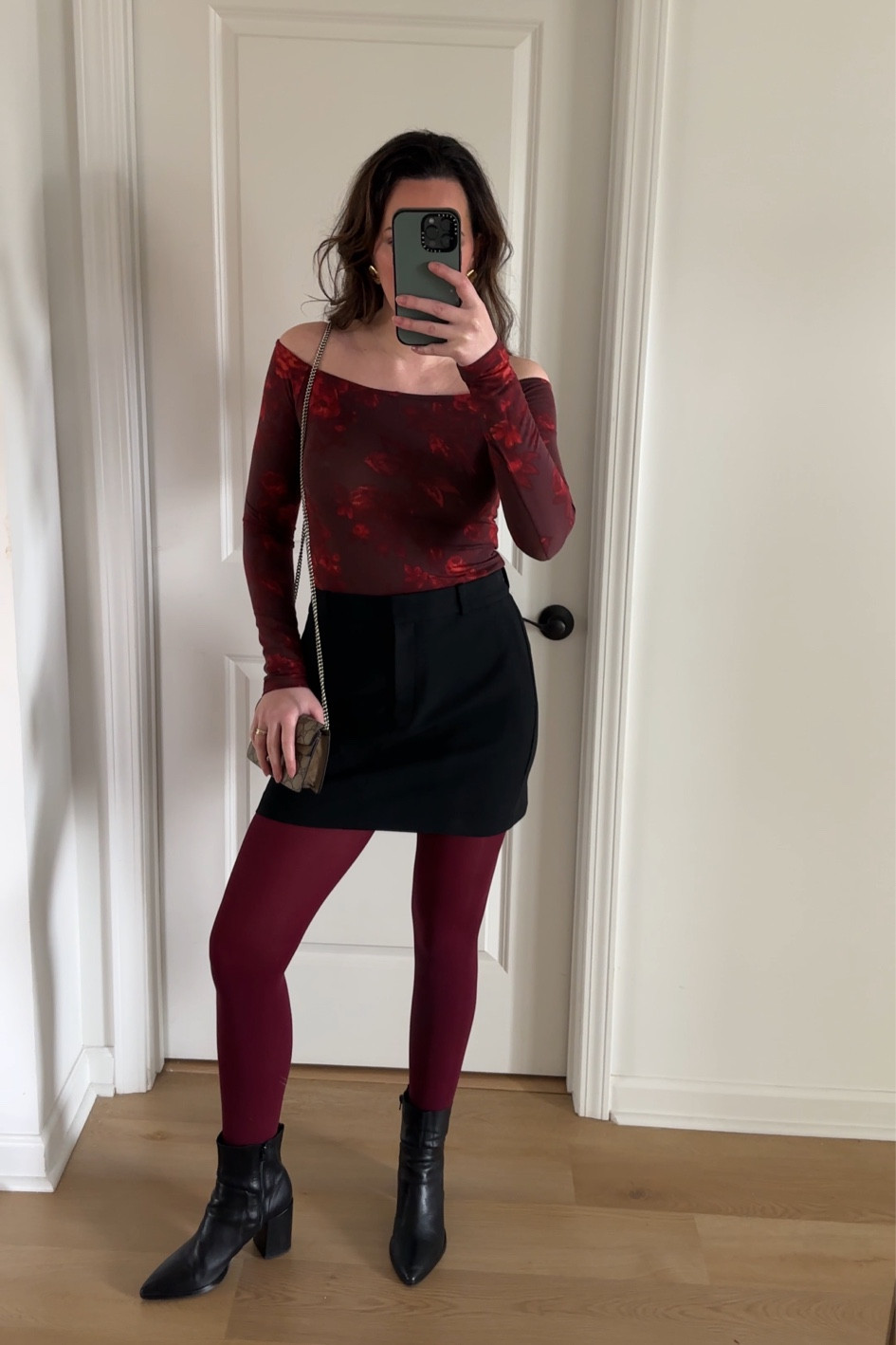 The burgundy tones of the tights and top create a harmonious, autumnal color palette that’s both trendy and flattering. The streamlined silhouette of the black skirt and boots gives the look a chic, sophisticated edge, seamlessly blending comfort with style.
