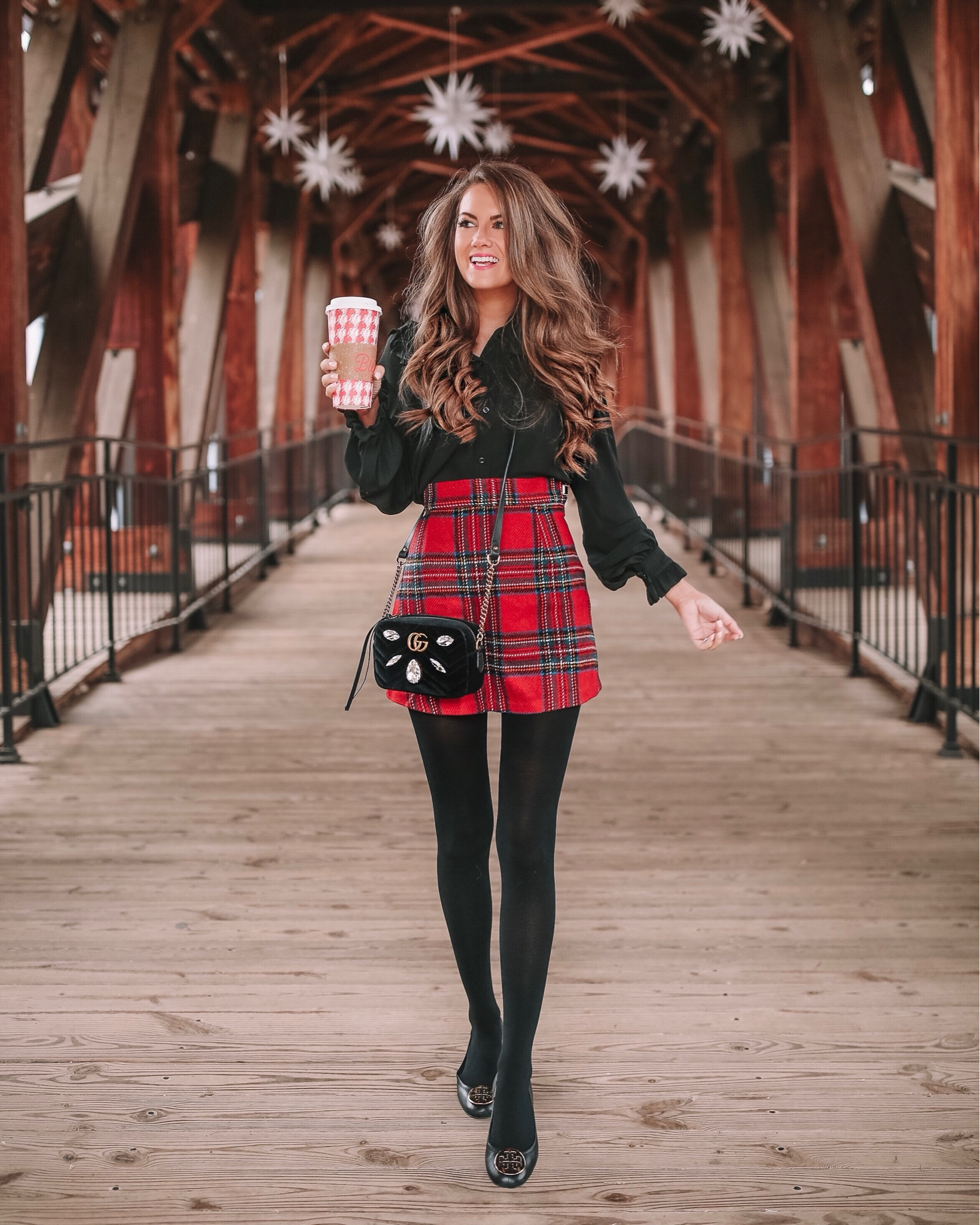 The vibrant red tartan skirt adds a festive and energetic pop of color, perfectly contrasting with the classic black of the top and tights, making the outfit stand out. Additionally, the playful cat-detail purse infuses a sense of whimsy and personality, which complements the ensemble’s youthful and fun aesthetic.