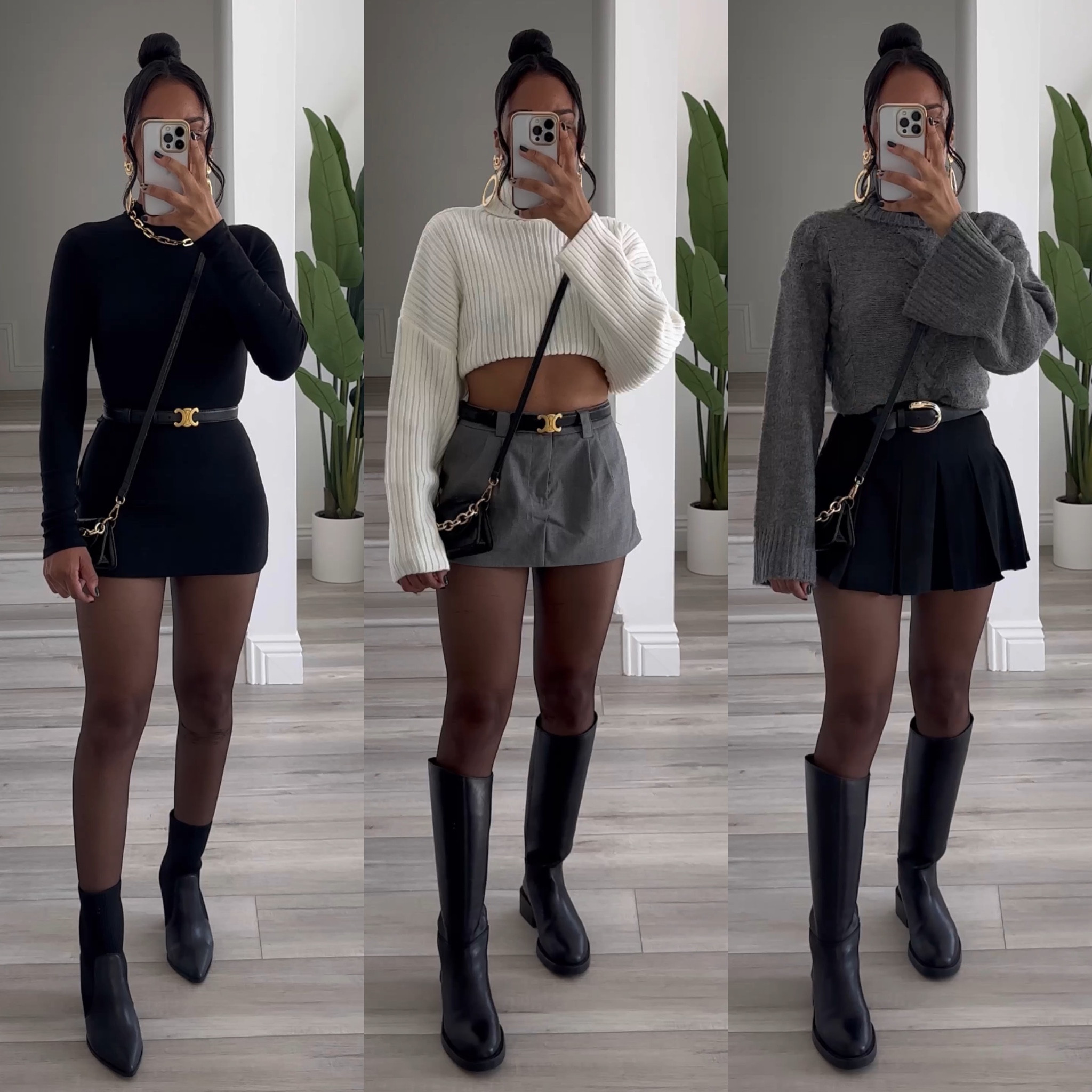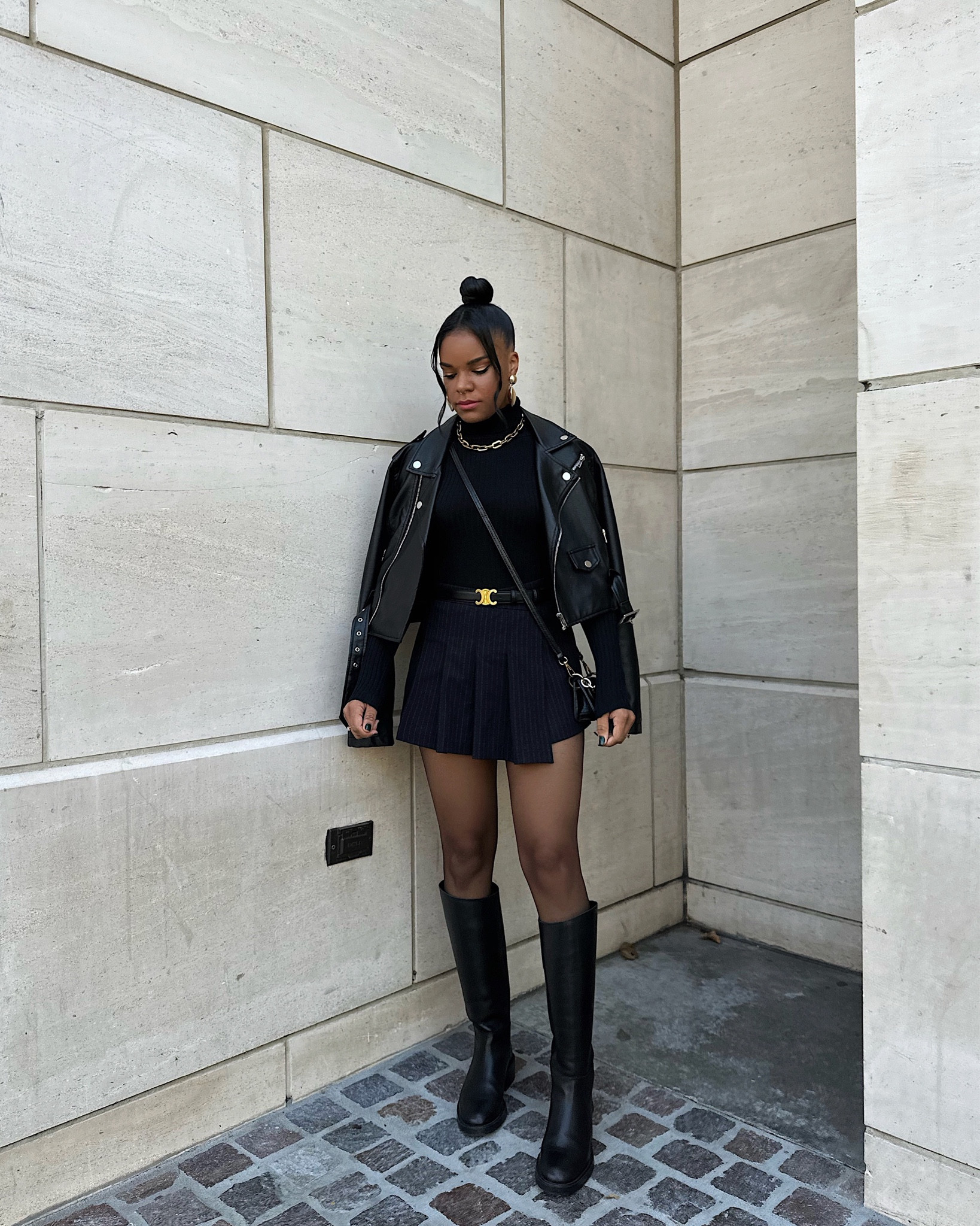 The ensemble exudes a chic, edgy vibe with its classic black turtleneck and pleated skirt, which are flawlessly complemented by the leather jacket and knee-high boots that add a bold, fashion-forward twist. The gold accents from the belt and jewelry infuse a touch of elegance, perfectly balancing the outfit’s toughness with a sprinkle of glam.