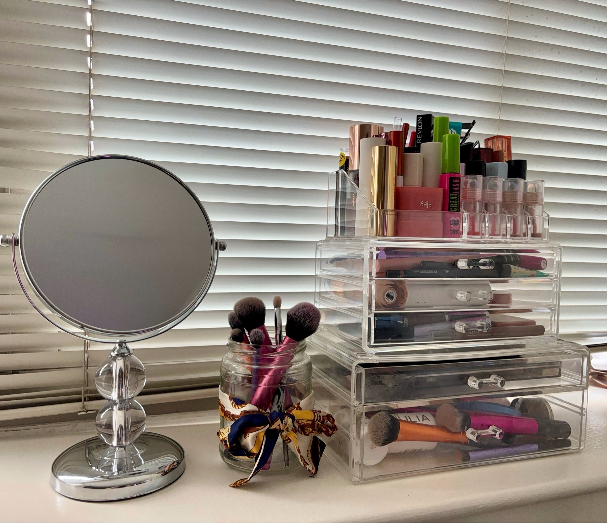 It appears there has been a misunderstanding, as the image presented does not show an outfit but rather a vanity with makeup products and brushes. If you have an image of an outfit that you would like reviewed, please provide that instead.