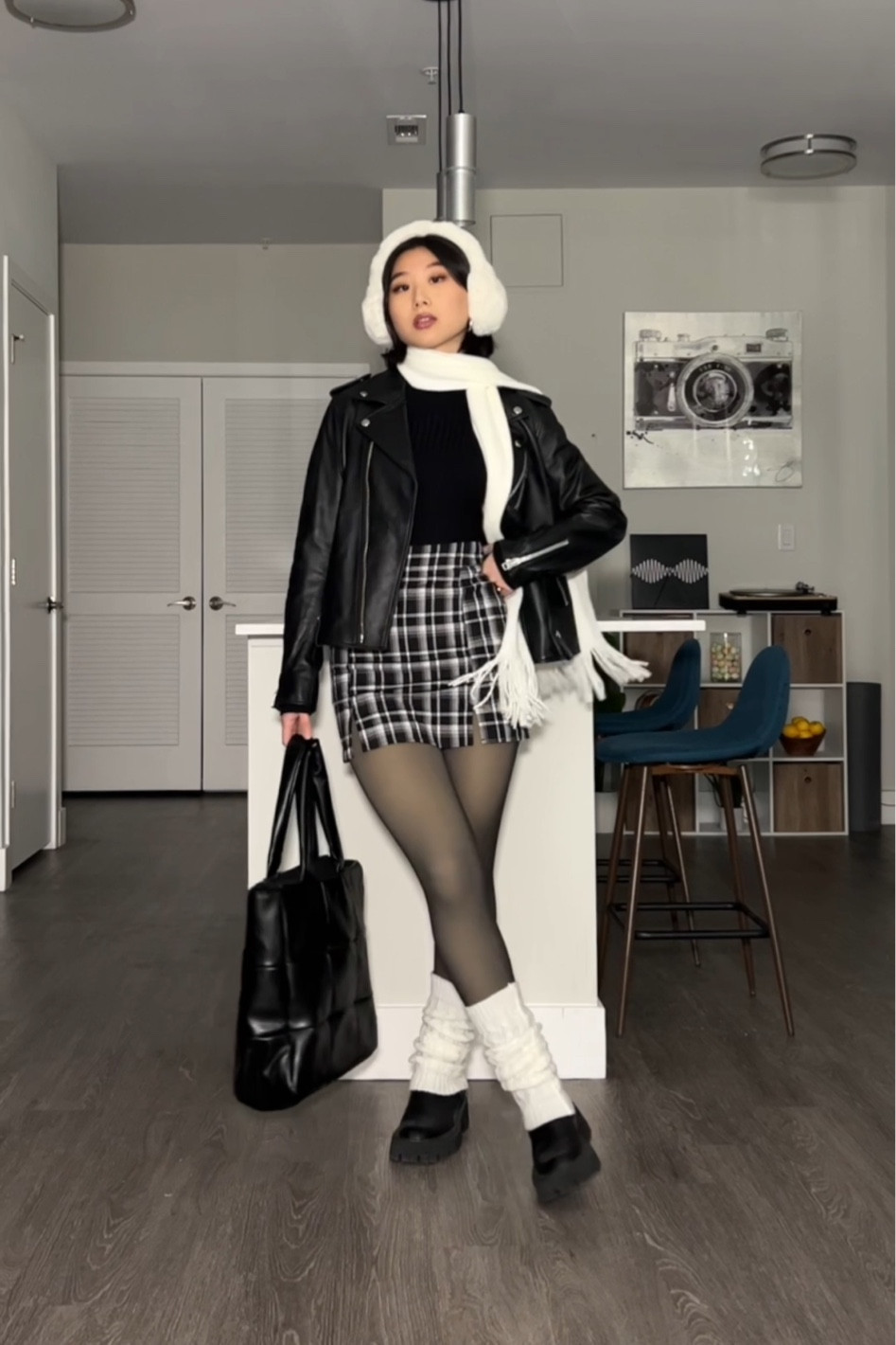 The juxtaposition of the classic black leather jacket with the chic plaid skirt creates a timeless yet edgy look, while the coordinated accessories—a white beret and scarf—add a touch of Parisian elegance that pulls the ensemble together cohesively. The ensemble’s balanced mix of textures and monochrome palette exemplify a sophisticated take on urban winter style.