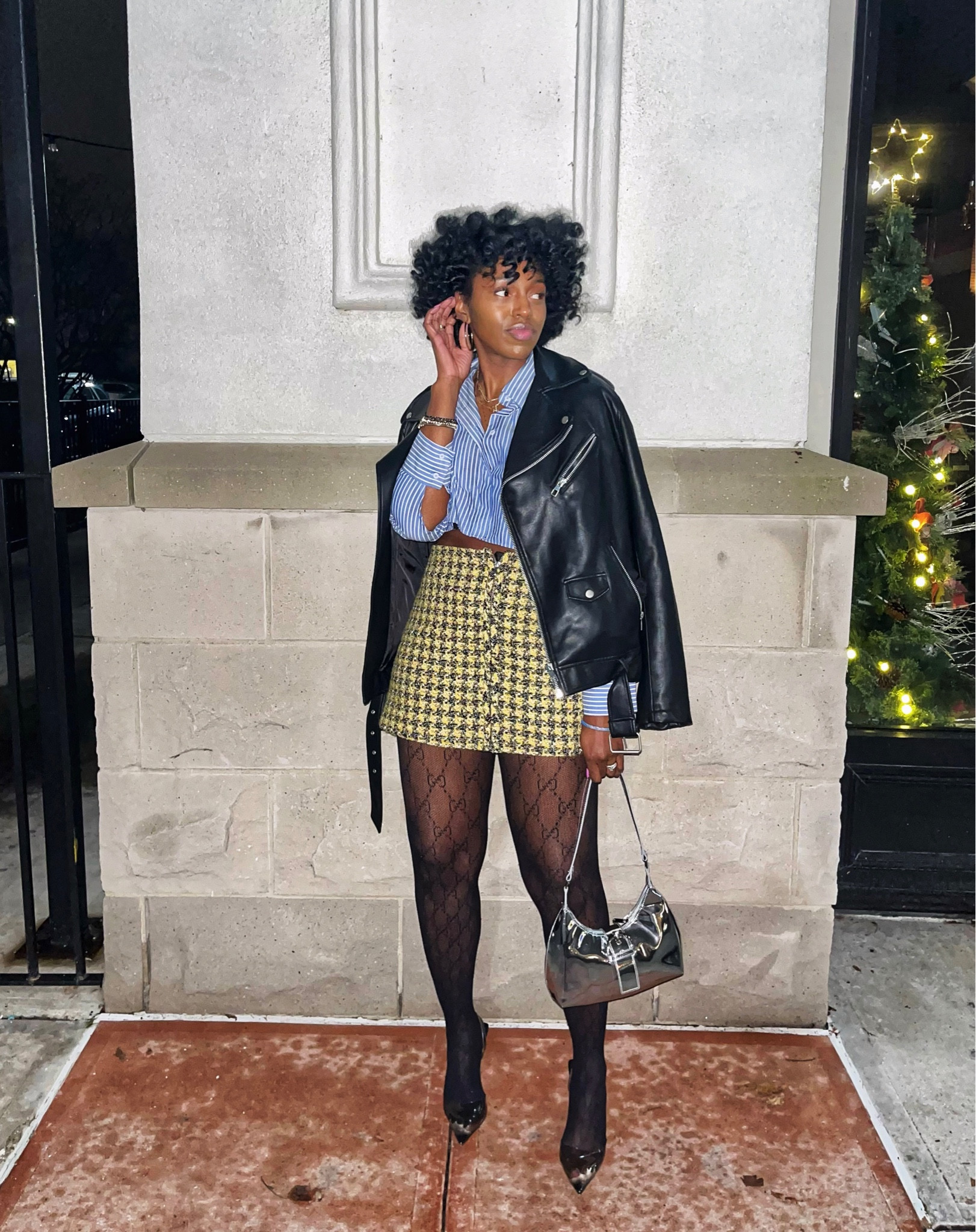 I appreciate the bold mix of patterns and textures in this outfit; the classic houndstooth skirt and lace tights make an elegant statement, while the leather jacket adds an edgy contrast. The outfit is nicely balanced with a structured handbag and sleek footwear, creating a chic and modern look.