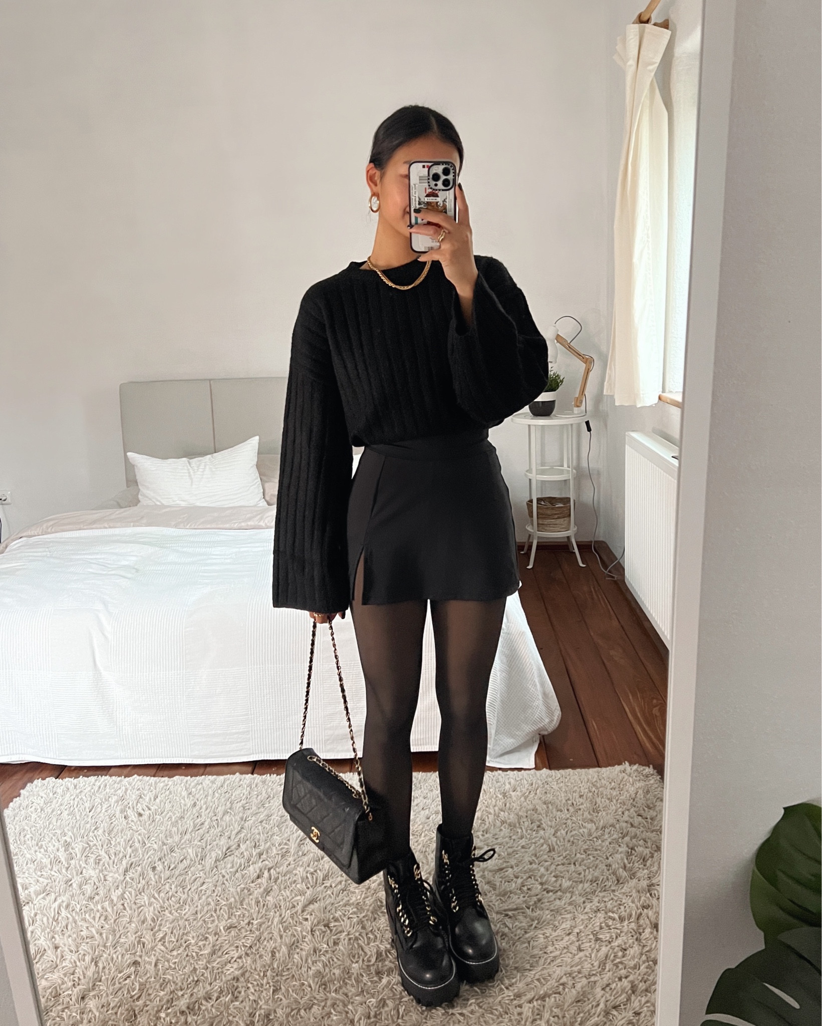 The monochromatic black palette creates a sleek and timeless look, while the combination of textures and sheer tights adds an edge of modern sophistication. The chunky boots and classic handbag serve as perfect accessories to balance the outfit’s femininity with a touch of boldness.
