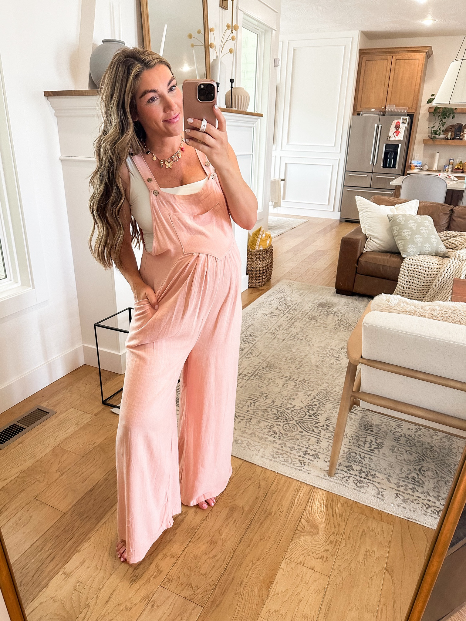 I love how the light pink overalls effortlessly blend comfort with style, giving off a relaxed yet chic vibe. The soft fabric and relaxed fit make it perfect for a casual day out while still looking polished.