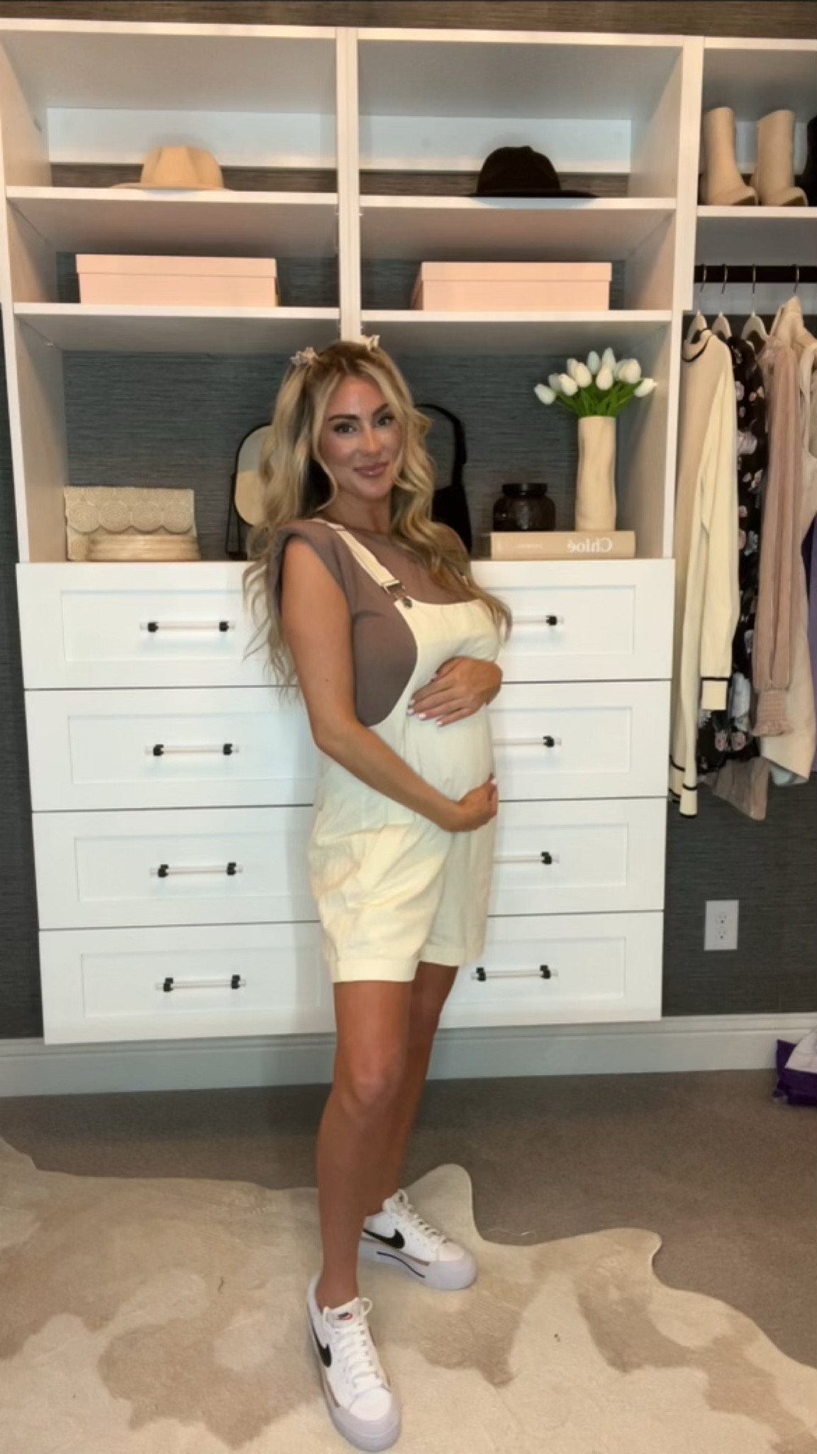 I love this outfit because the fitted, pastel dress beautifully accentuates the baby bump while offering a clean, minimalistic look. Pairing it with trendy sneakers adds a touch of casual comfort that’s both chic and practical for everyday wear.