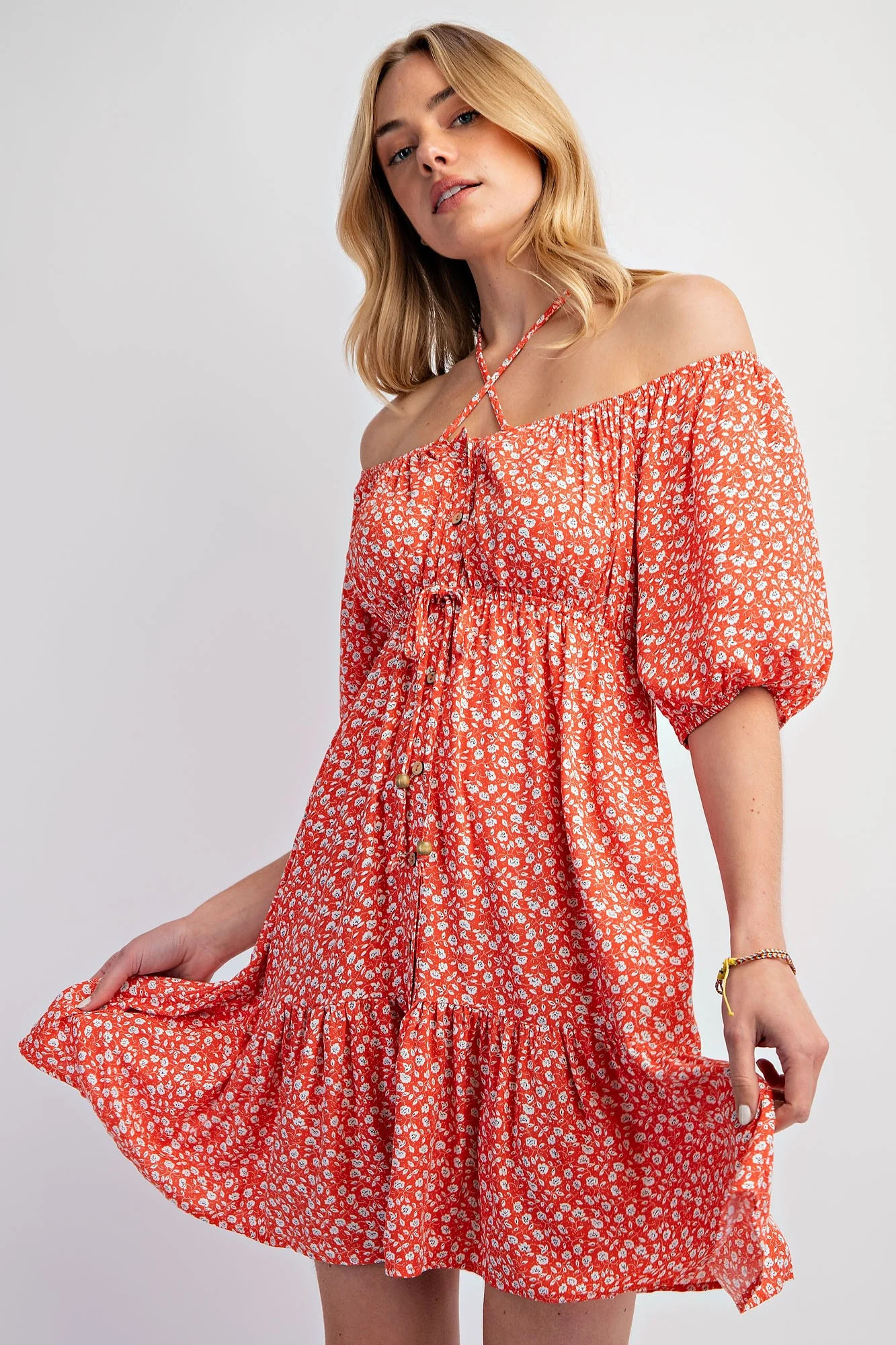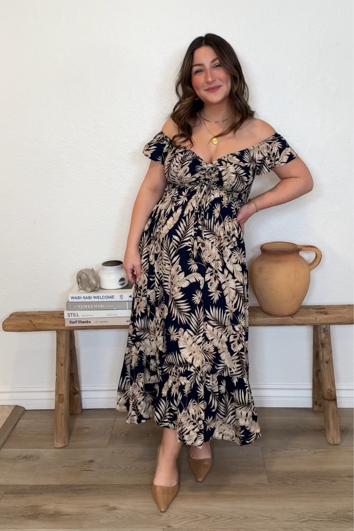 I love the way this off-the-shoulder dress combines elegance with a relaxed, tropical vibe, making it perfect for both casual and semi-formal occasions. The flattering cut and the earthy tones create a harmonious balance that feels both sophisticated and effortless.