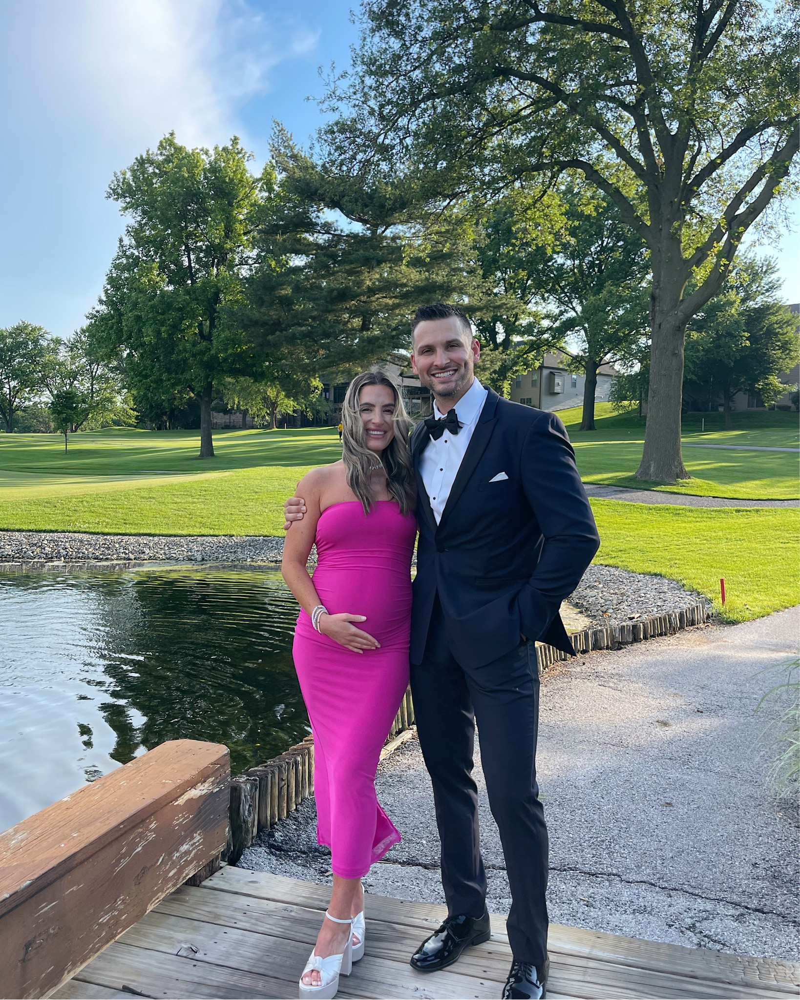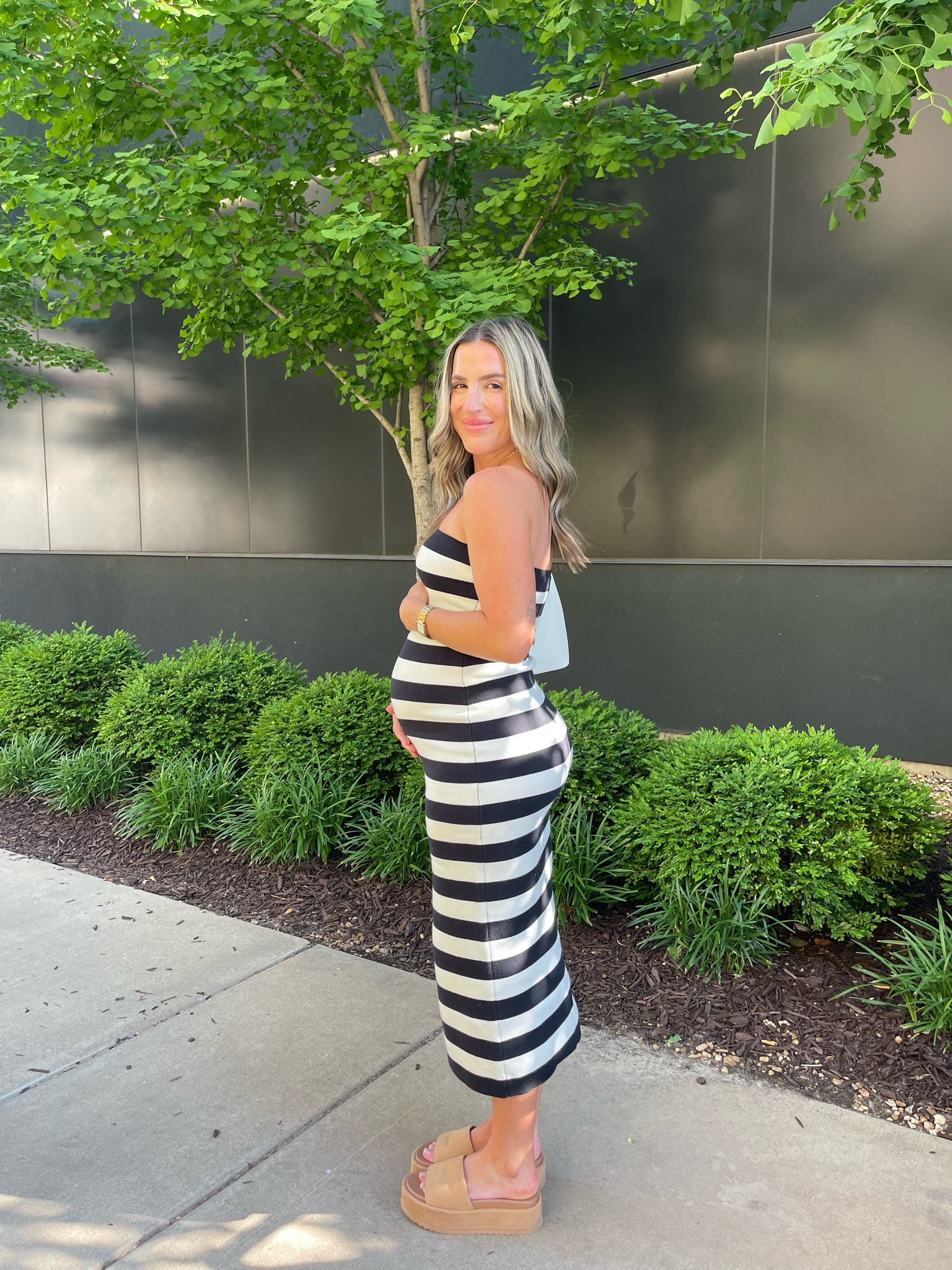 I love the way the black and white stripes of this dress create a chic, modern look while flattering the baby bump beautifully. Paired with the neutral wedges, it strikes the perfect balance between comfort and style.