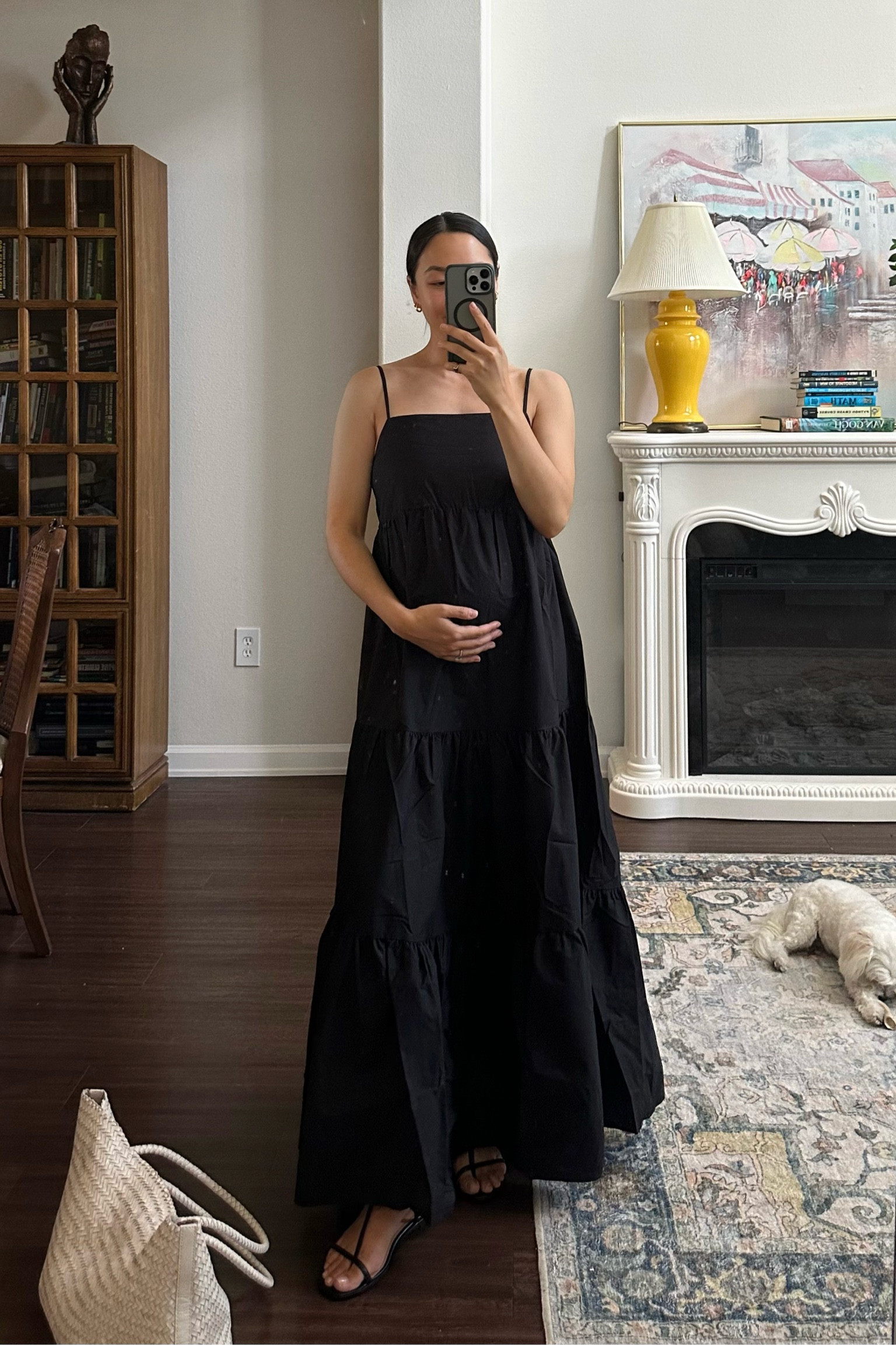 I love this outfit because it’s both comfortable and chic, with the black dress perfectly accentuating the baby bump while pairing effortlessly with the stylish sandals. The simplicity of the look is elegantly complemented by the subtle details, making it perfect for any casual outing.
