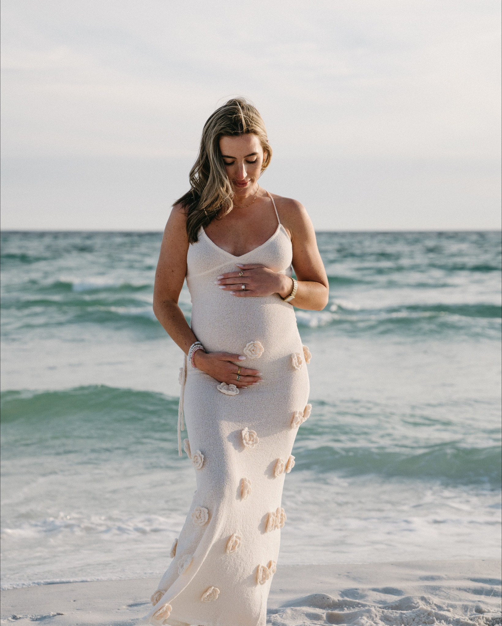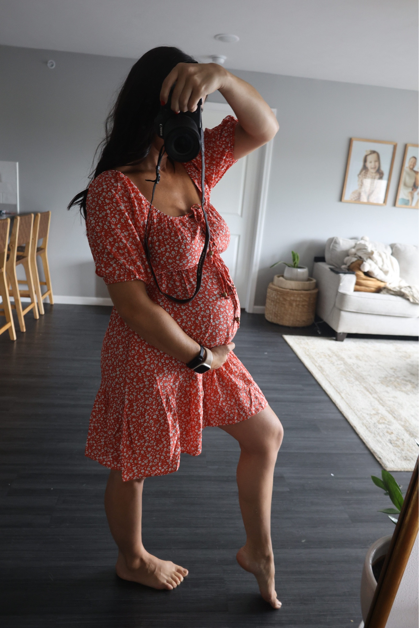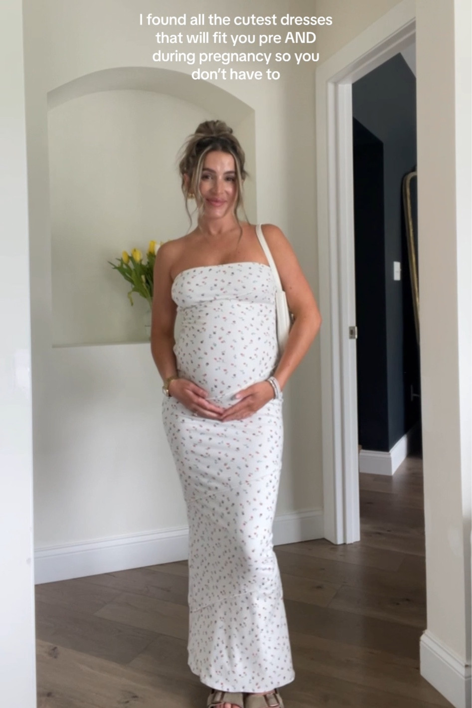 I love how this dress perfectly combines comfort and style with its flattering fit and delicate print, making it ideal for both pre and during pregnancy. The soft fabric looks comfortable, and the strapless design adds an elegant touch to the overall look.