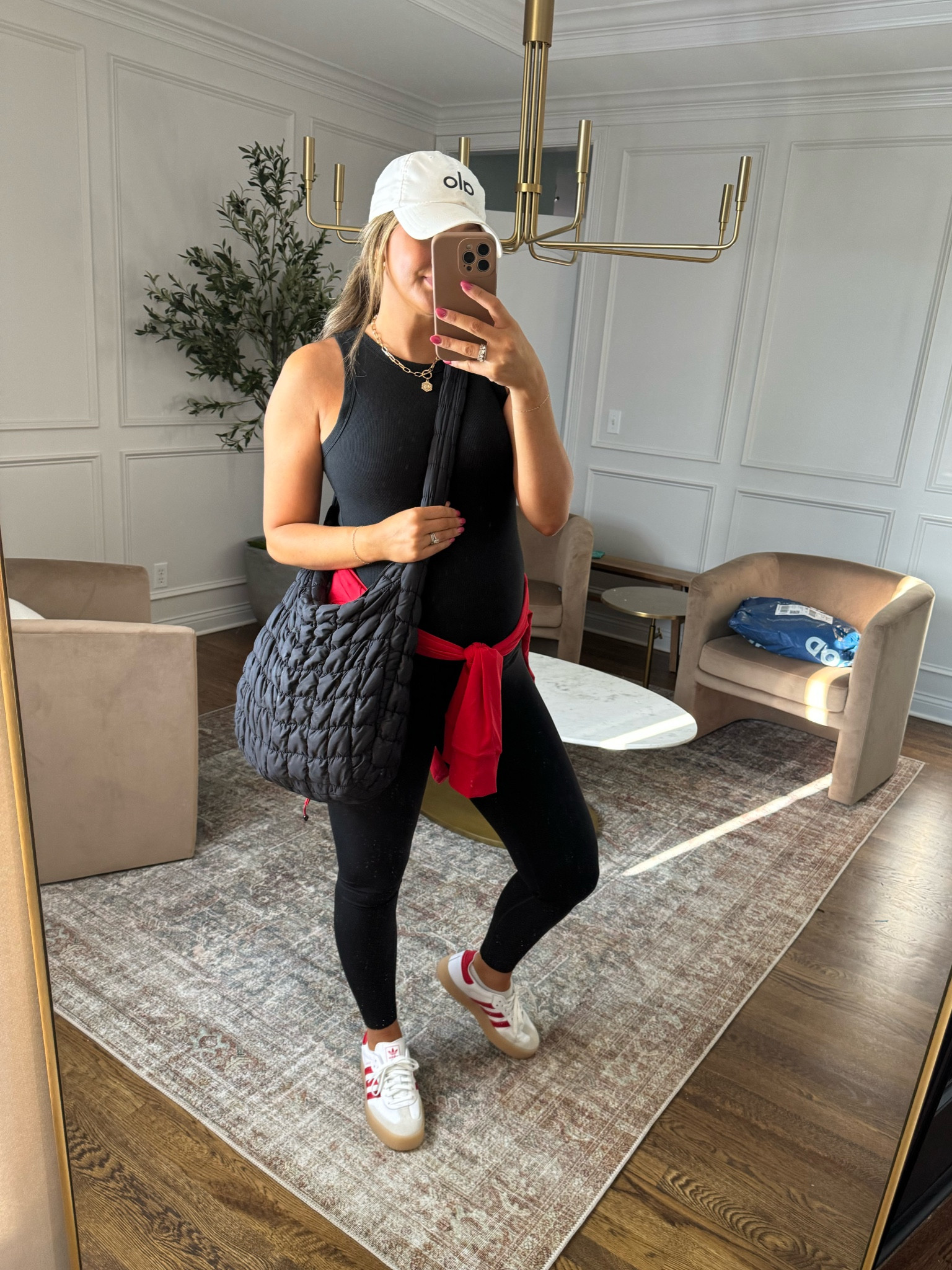 I love how this outfit combines comfort and style with its sleek black base, effortlessly elevated by the pop of color from the red sweatshirt. The accessories, including the casual baseball cap and quilted tote, add a laid-back but chic touch.
