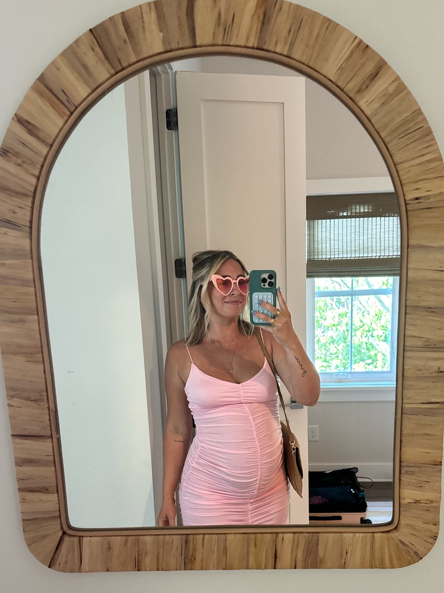 I love how the soft pink bodycon dress highlights my baby bump beautifully, creating a flattering and feminine silhouette. The heart-shaped sunglasses add a fun and playful touch to the overall look.