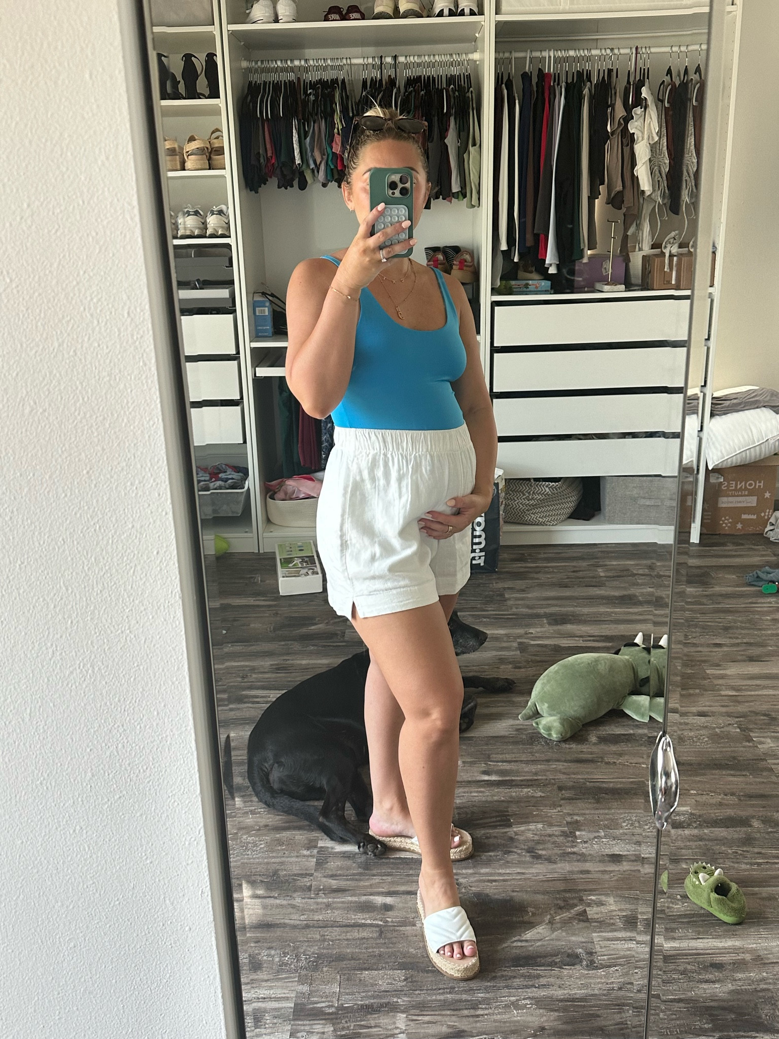 I love this outfit because the vibrant blue tank top adds a pop of color, while the white shorts keep it fresh and modern. The casual yet stylish look is perfect for a comfortable day out, and the slide sandals add a chic finishing touch.