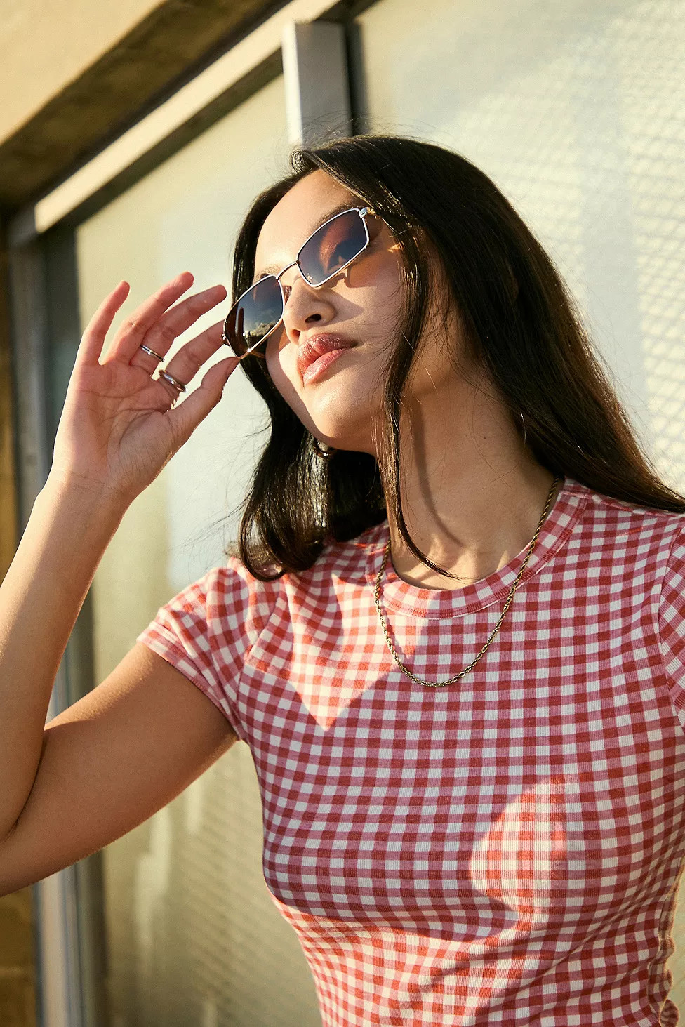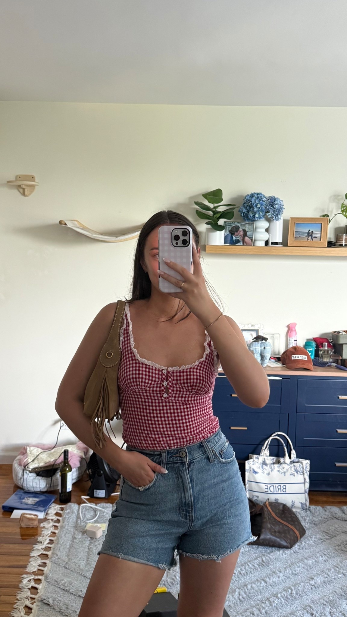 – I love the casual vibe of the gingham top paired with classic denim shorts; it feels perfect for a sunny day.