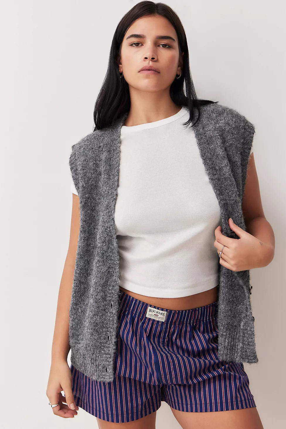 – I love how the cozy sweater contrasts with the playful, striped shorts—it’s a fun and laid-back combo.