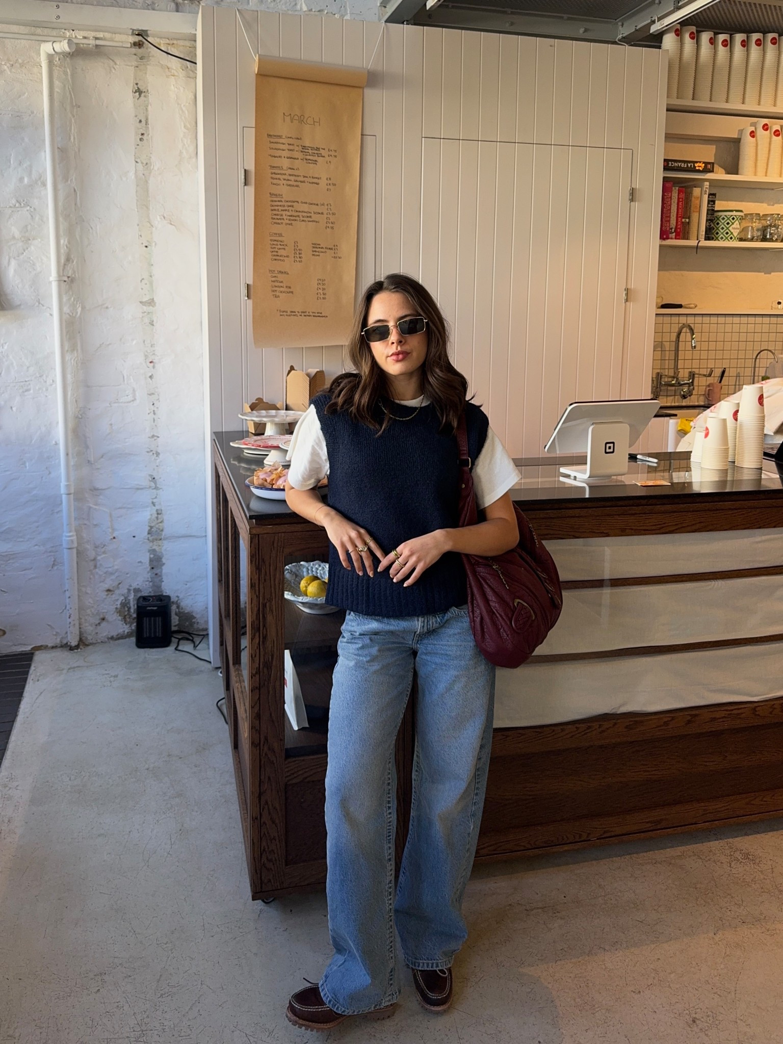 – The wide-leg jeans add a relaxed vibe, making the whole look effortlessly cool.