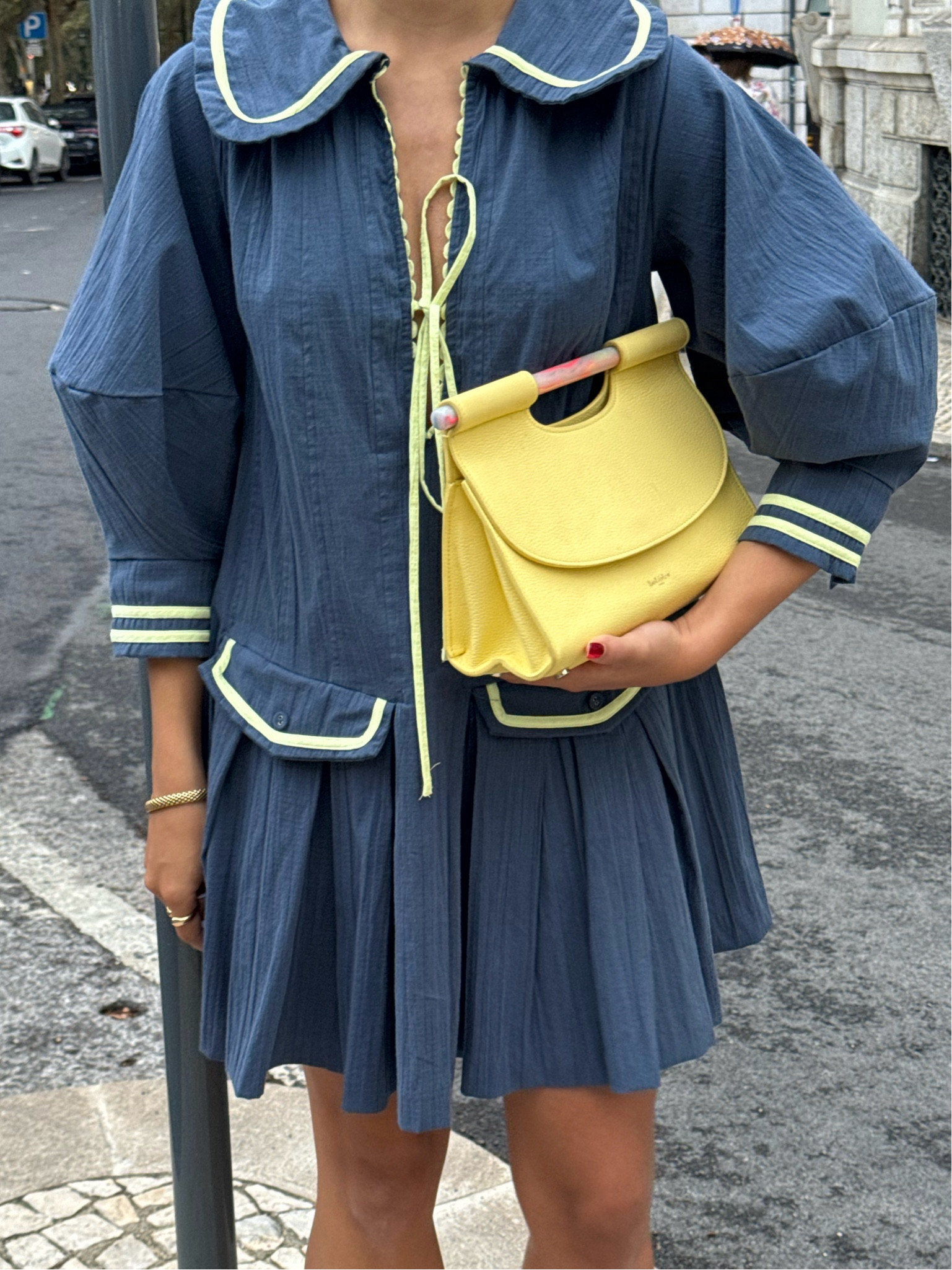 – The subtle yellow trim adds a fun pop of color, matching nicely with the bold yellow handbag.