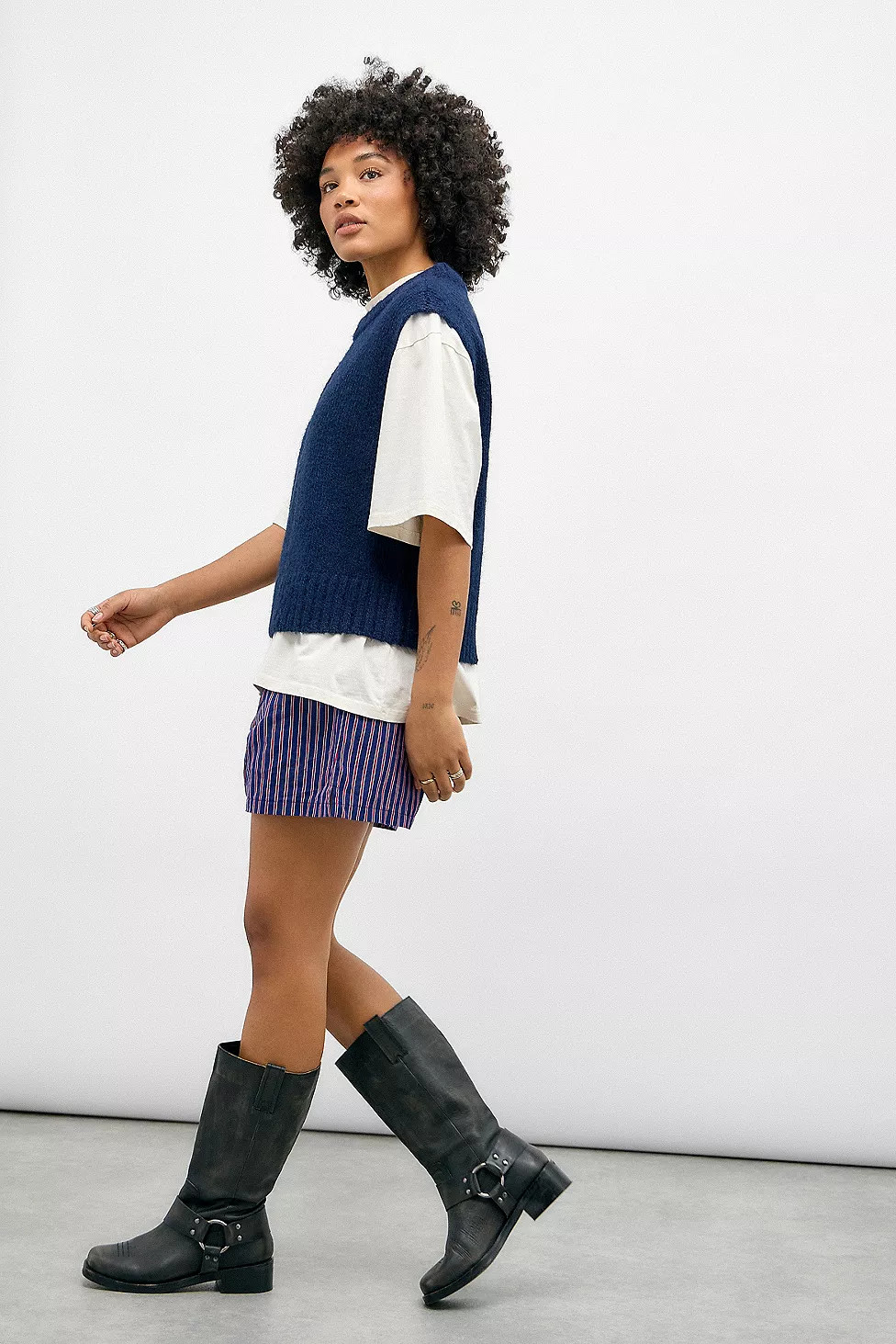 – I love the casual vibe of the white tee and navy vest combo—so relaxed and stylish.