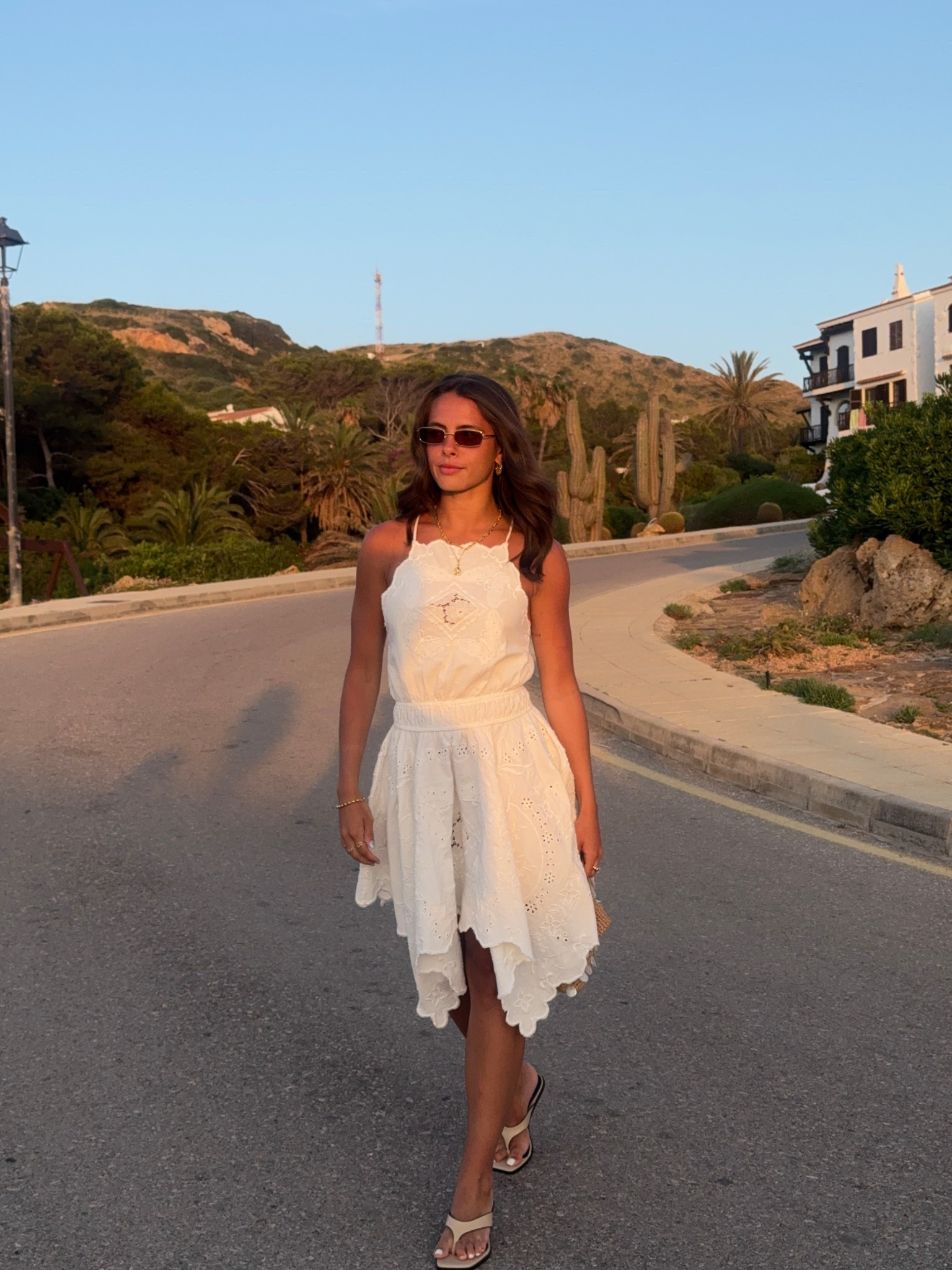 – The sunglasses and sandals perfectly complement the casual yet chic look.