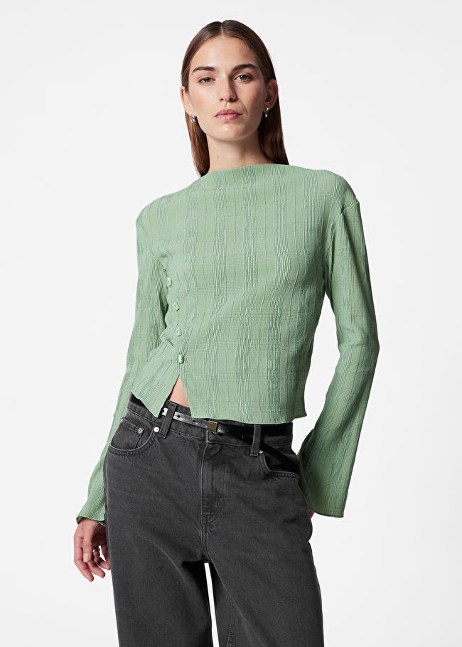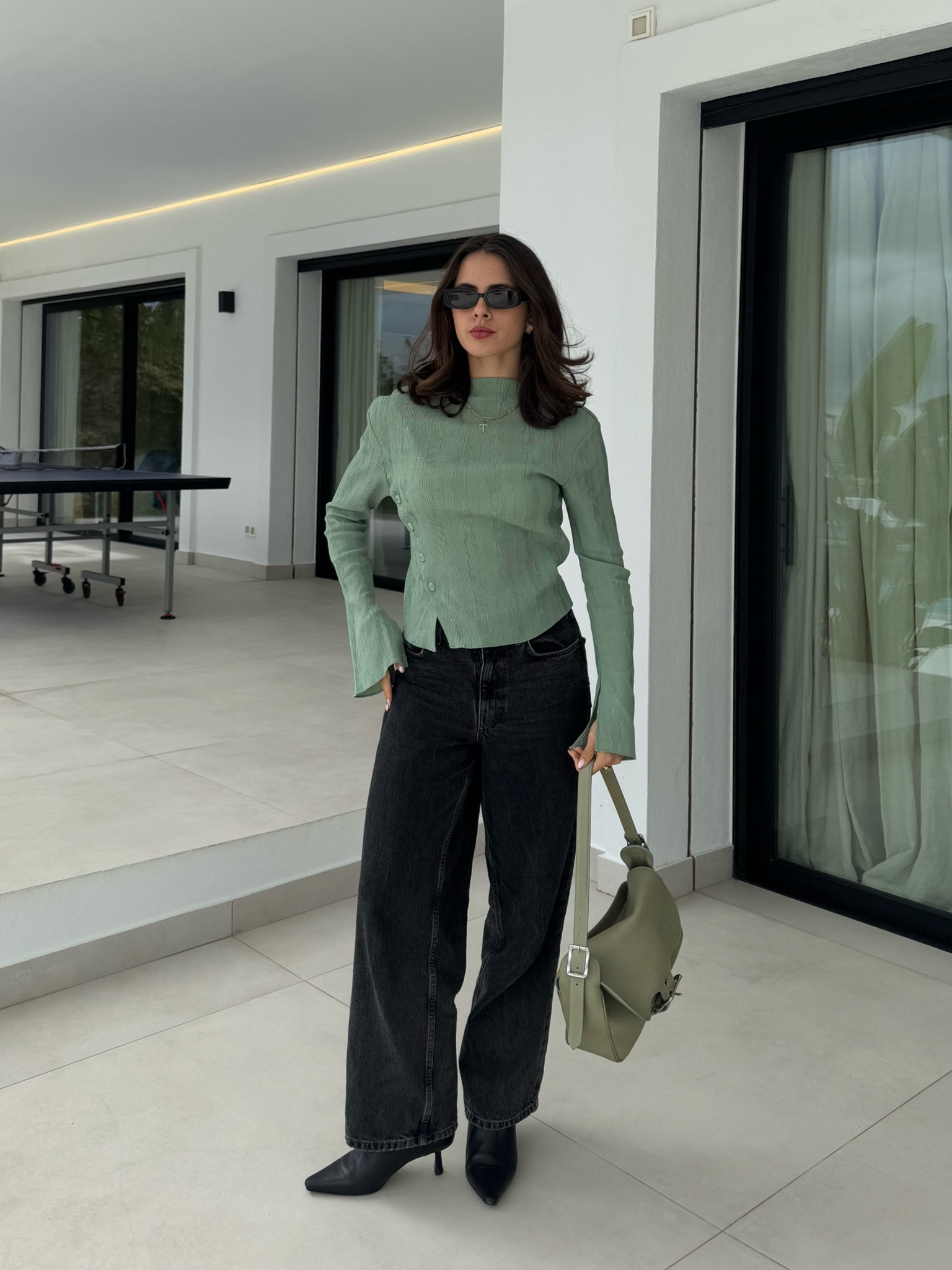 – I love the muted green top; it’s understated but chic.