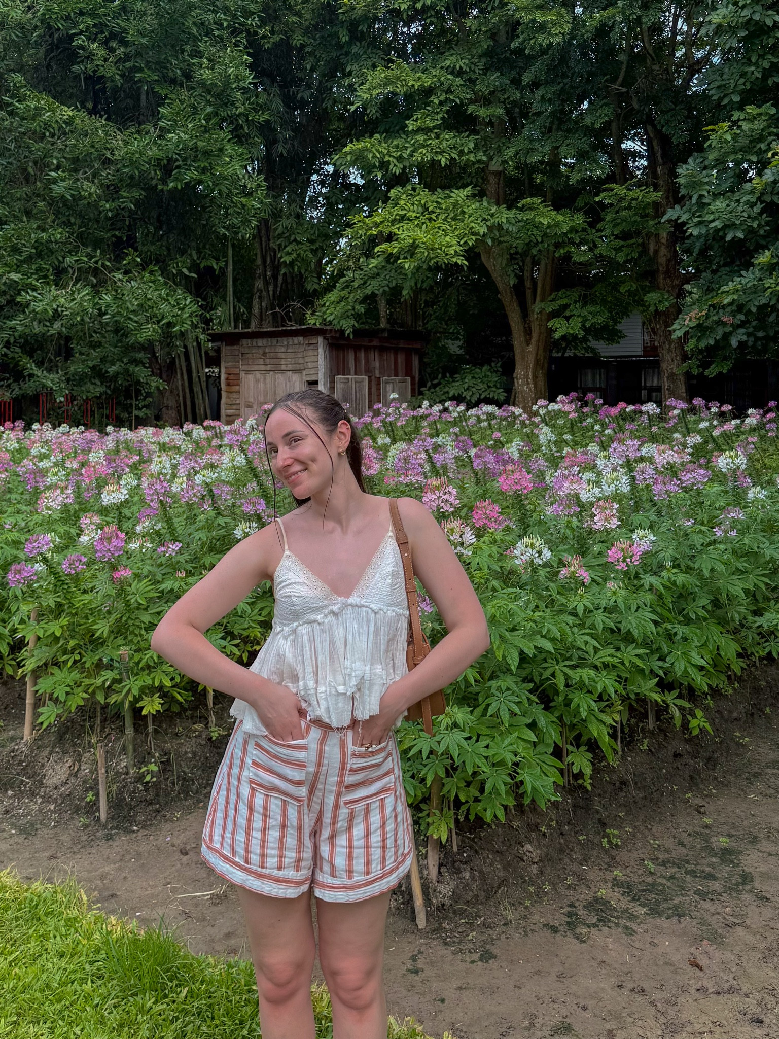 – I love how this outfit combines a light, airy top with playful striped shorts, perfect for a casual day out.
