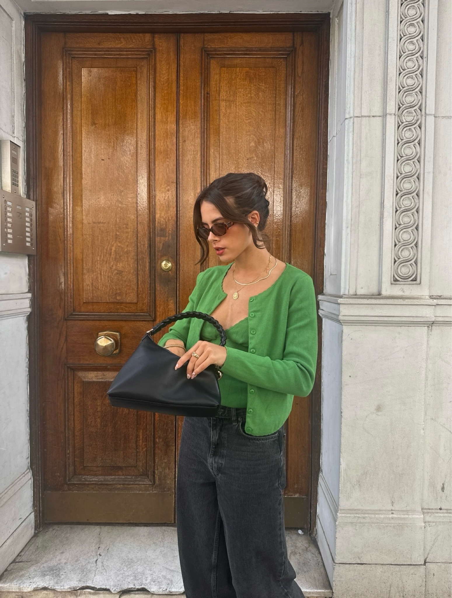 – The small details, like the sunglasses and simple gold jewelry, add a chic finish to the whole ensemble.