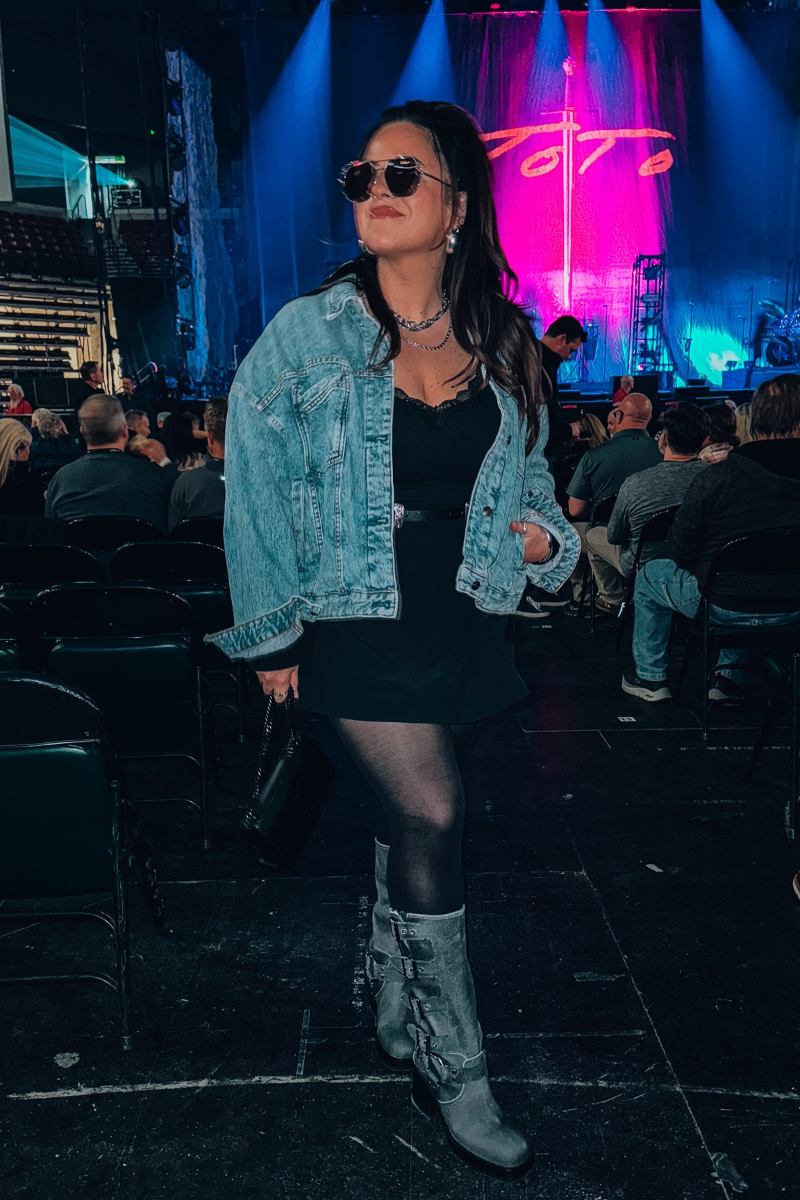 The denim jacket adds a classic, versatile touch to the ensemble, complementing the timeless little black dress underneath. The combination of textured tights and rugged boots provides an edgy contrast, showcasing a harmonious blend of femininity and toughness.
