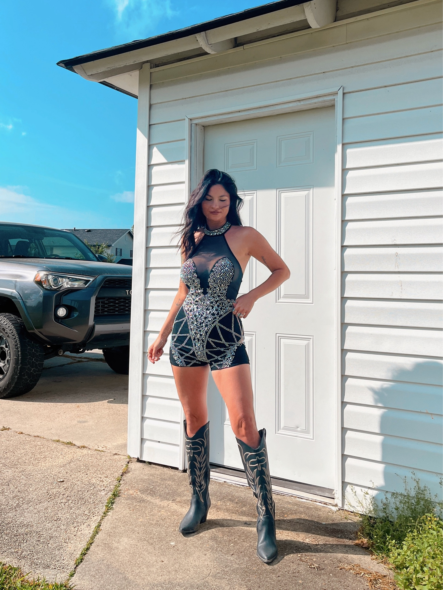 The bold geometric pattern of the romper creates a striking visual impact, adding a sense of modern edge, while the cowboy boots inject a playful, eclectic twist that effortlessly marries chic with country. The monochromatic color scheme keeps the ensemble cohesive and sophisticated.