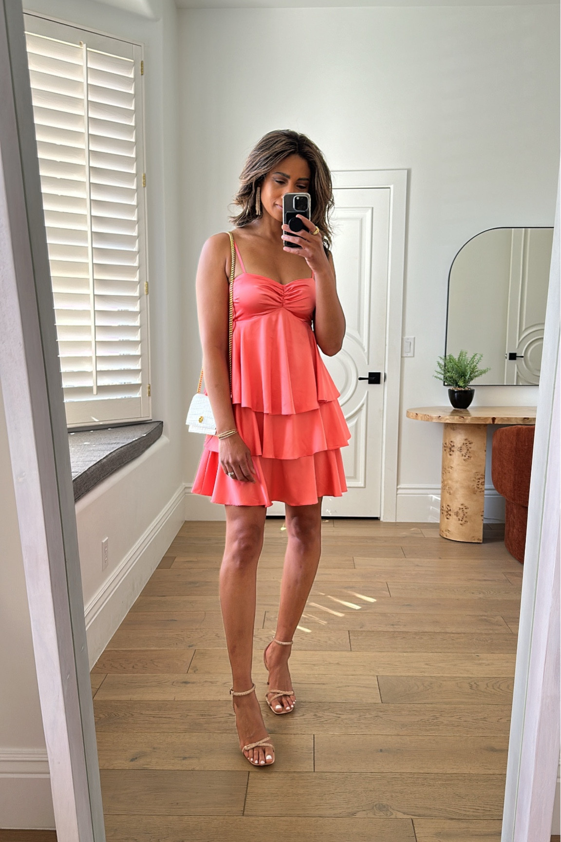 The vibrant coral hue of the dress exudes a lively and youthful charm, complementing the wearer’s complexion, while the flared skirt and fitted bodice create a flattering silhouette that accentuates the waist and adds a playful, feminine flair. The choice of nude strappy heels elongates the legs, ensuring a polished and cohesive ensemble.