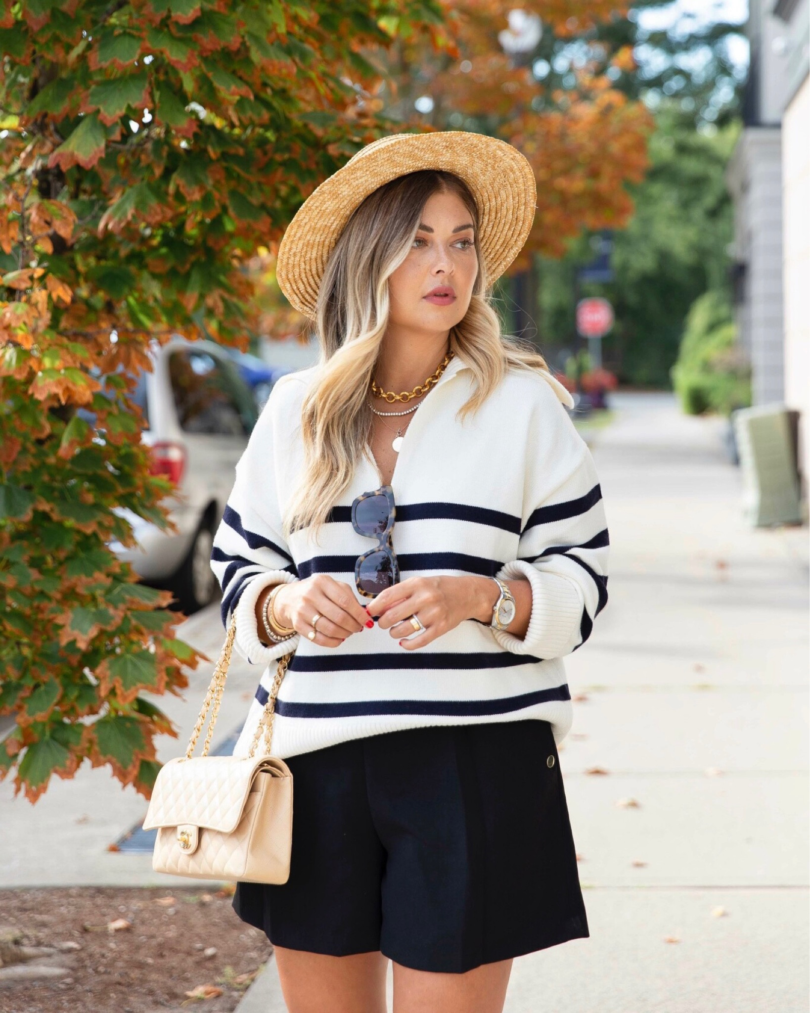 The effortlessly chic ensemble pairs a classic striped sweater with tailored shorts, creating a timeless nautical vibe perfect for a summer day. The ensemble is accessorized perfectly with a statement straw hat, chunky gold jewelry, and a sophisticated crossbody bag, adding a touch of elegance to a casual look.