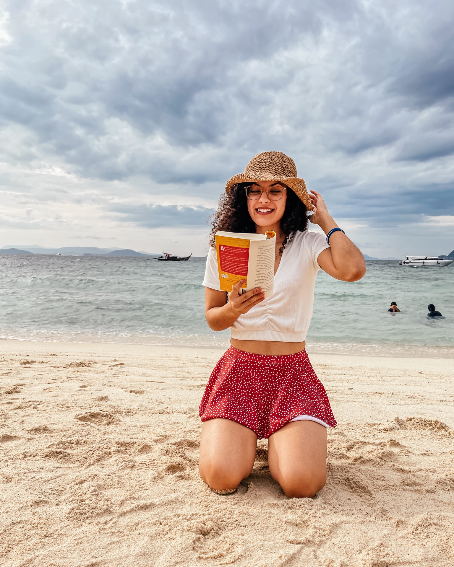 The ensemble is perfect for a beach setting, with a playful pattern on the shorts adding a pop of color and a breezy, wide-brimmed hat that is both stylish and functional for sun protection. The overall look is effortlessly chic and well-suited for a relaxed yet fashionable seaside outing.