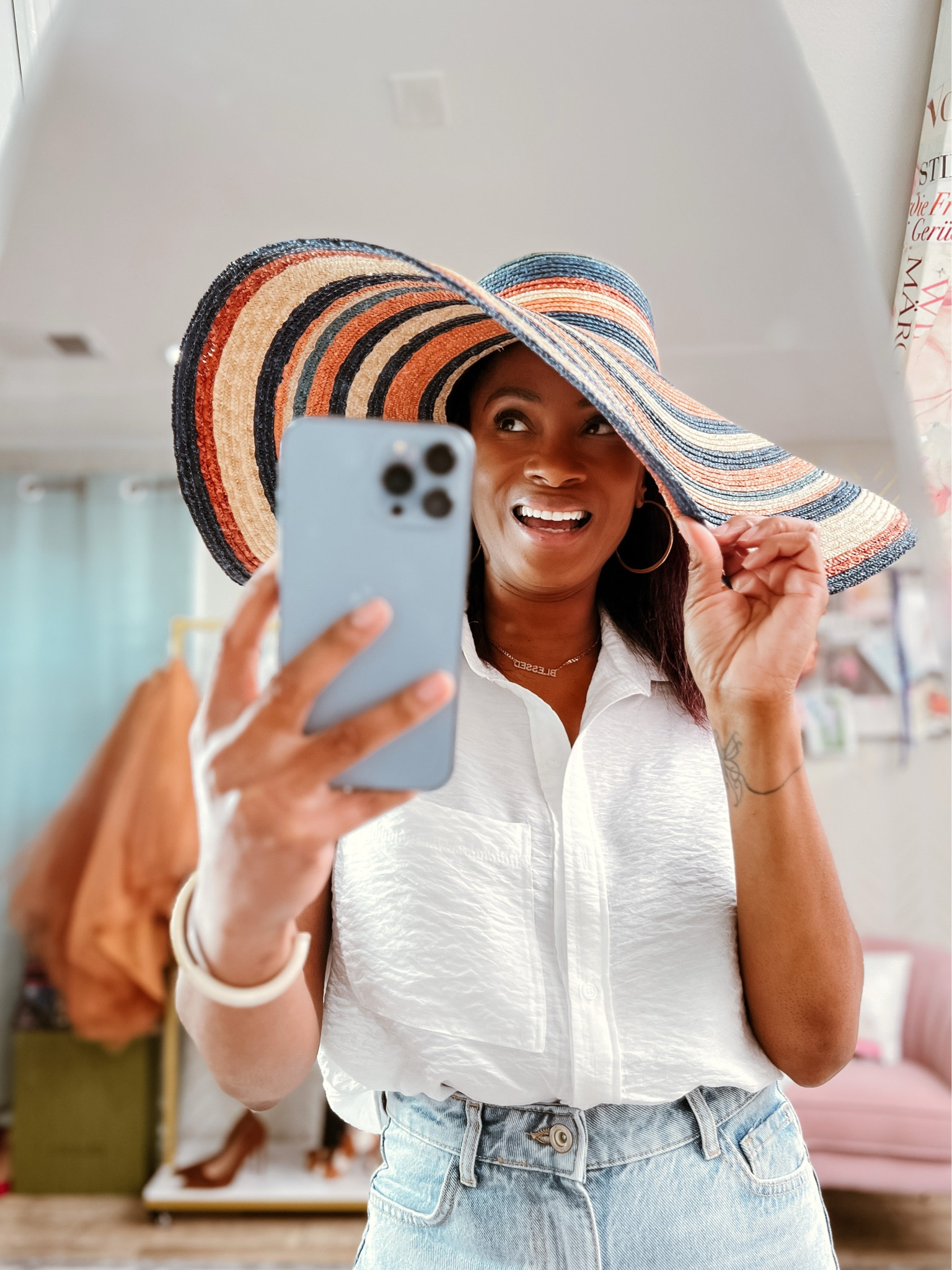 The wide-brimmed hat adds a playful yet sophisticated touch, with its stripes offering a pop of pattern that complements the classic simplicity of the crisp white shirt and denim combo. The ensemble balances comfort with a chic aesthetic, perfect for a casual, stylish outing.