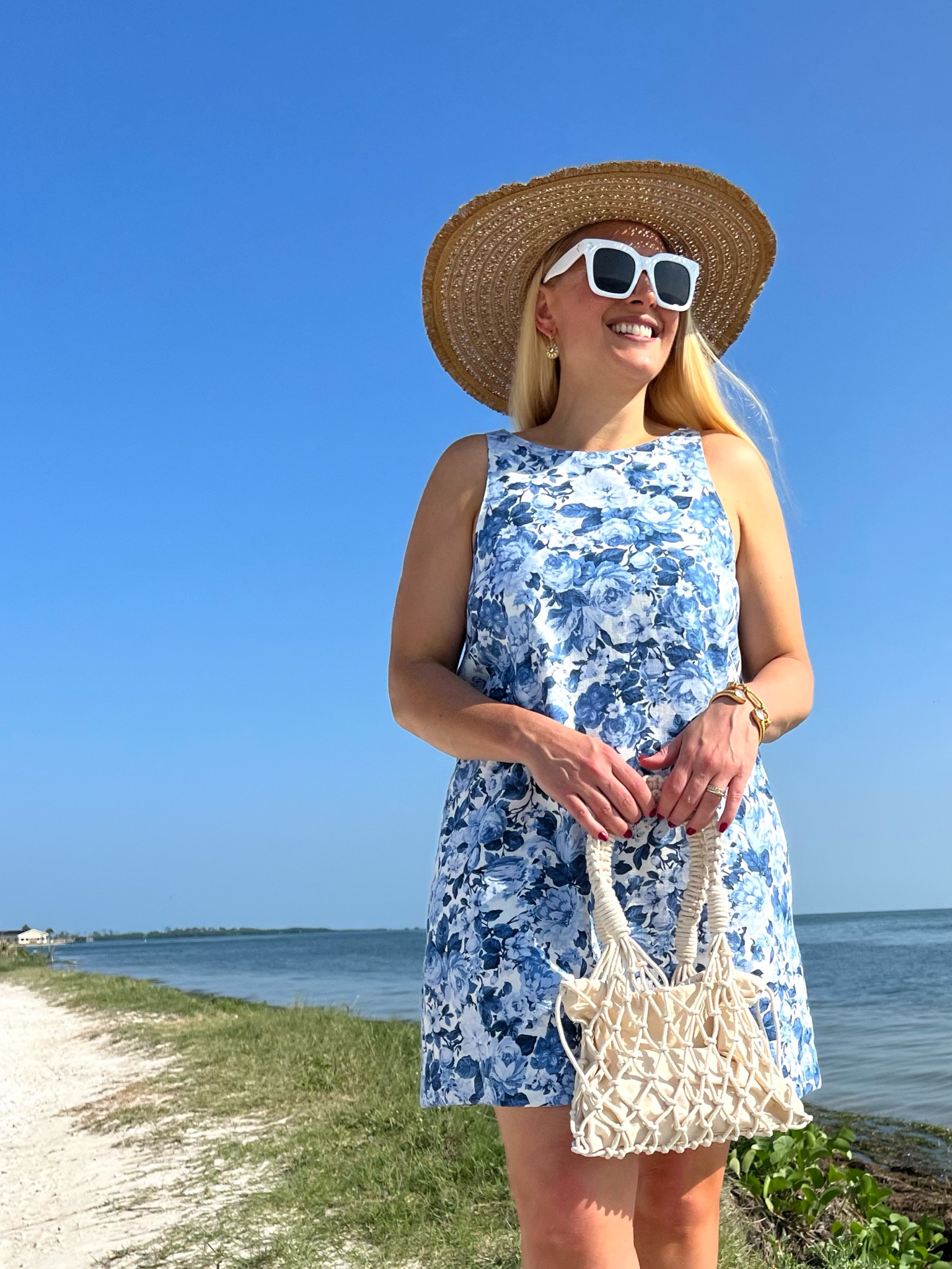 The airy, floral dress carries a breezy, summery vibe perfect for a beachside stroll, complemented exquisitely by the natural textures of the straw hat and woven bag, which add a touch of effortless chic. The white sunglasses are a trendy, bold accessory that rounds out the ensemble with a modern flair.