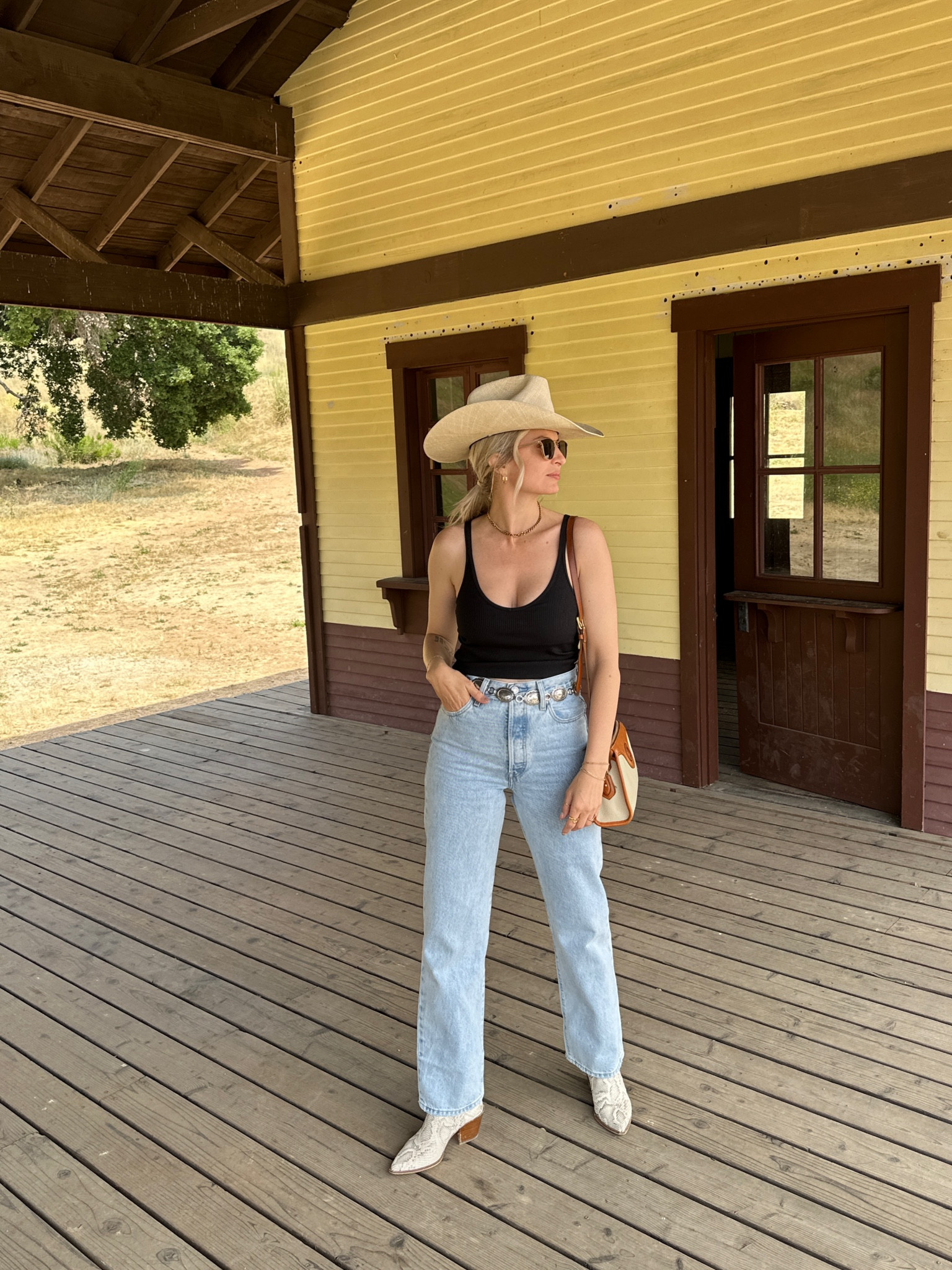 The wide-brimmed hat and sunglasses add a timeless touch, embracing both functionality and style, while the high-waisted jeans accentuate the silhouette, complemented by the neutral tones of the accessories for a cohesive, casual-chic look.