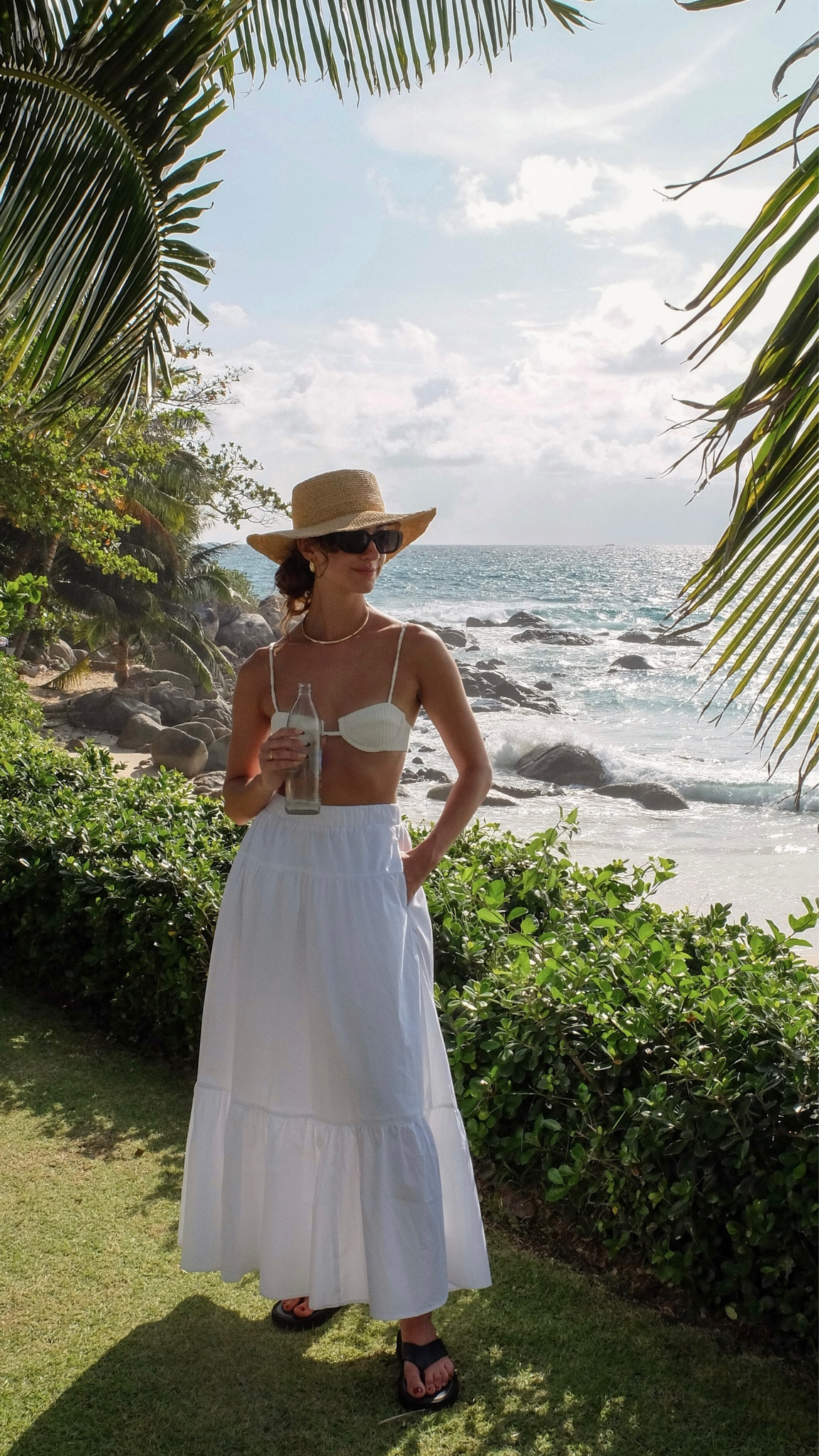 The ensemble exudes effortless elegance with its chic monochrome palette, punctuated by tasteful gold accessories that add a touch of glamour. The wide-brimmed straw hat and oversized sunglasses infuse the look with a classic Riviera sophistication.