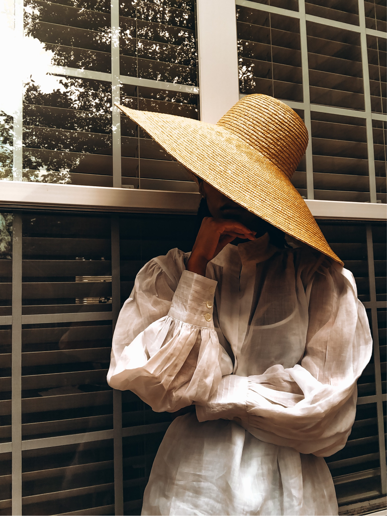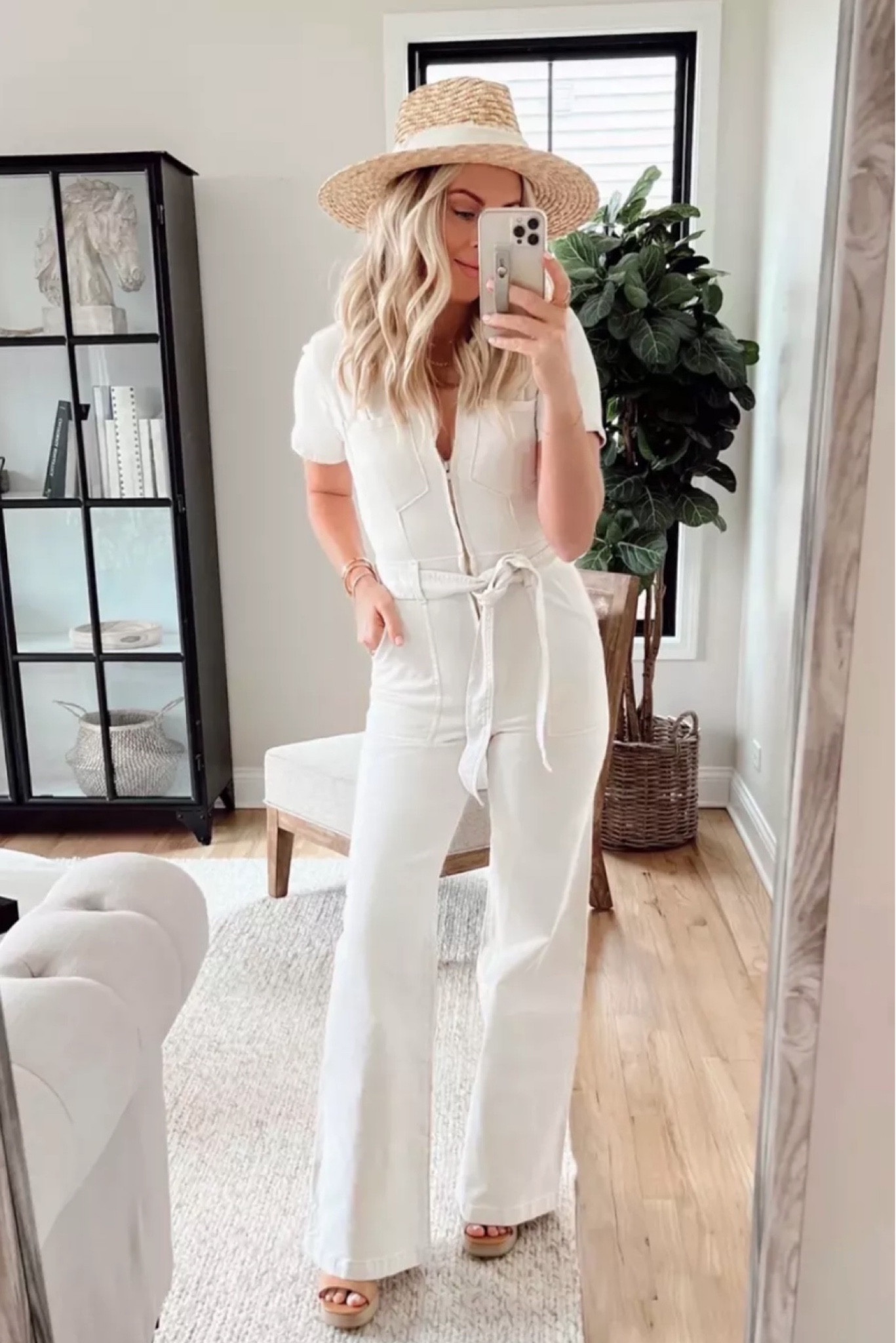 The monochromatic white ensemble exudes a crisp, sophisticated vibe, perfectly balanced with a wide-brim straw hat that adds a touch of relaxed, summery flair. Additionally, the cinched waist with a tie detail flatters the silhouette, making the overall look both stylish and figure-accentuating.