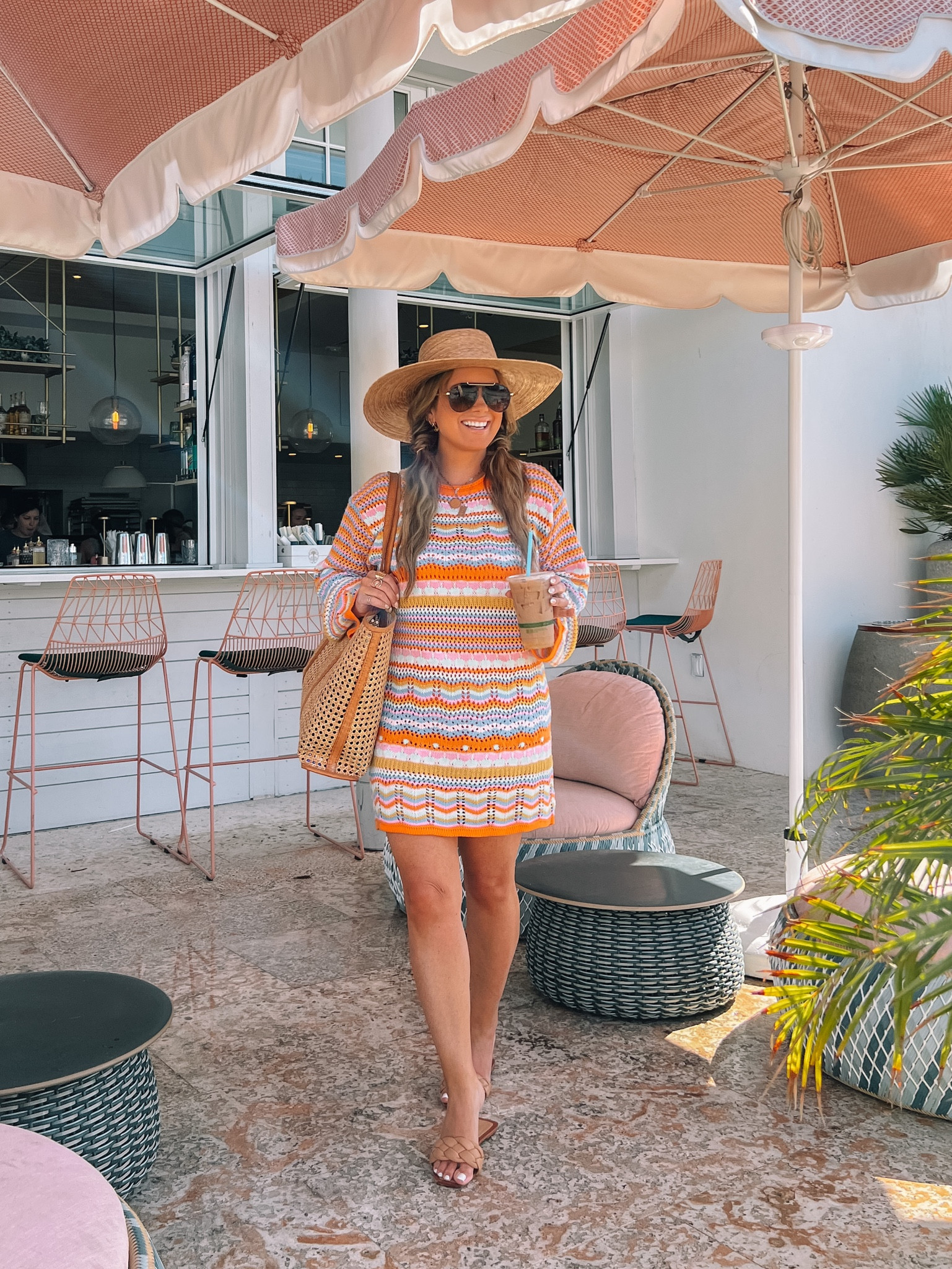 The breezy, open-knit sweater paired with shorts offers a chic, laid-back aesthetic perfect for a relaxed yet stylish vacation vibe. The straw hat and slide sandals complete the look with a nod to effortless summery elegance.