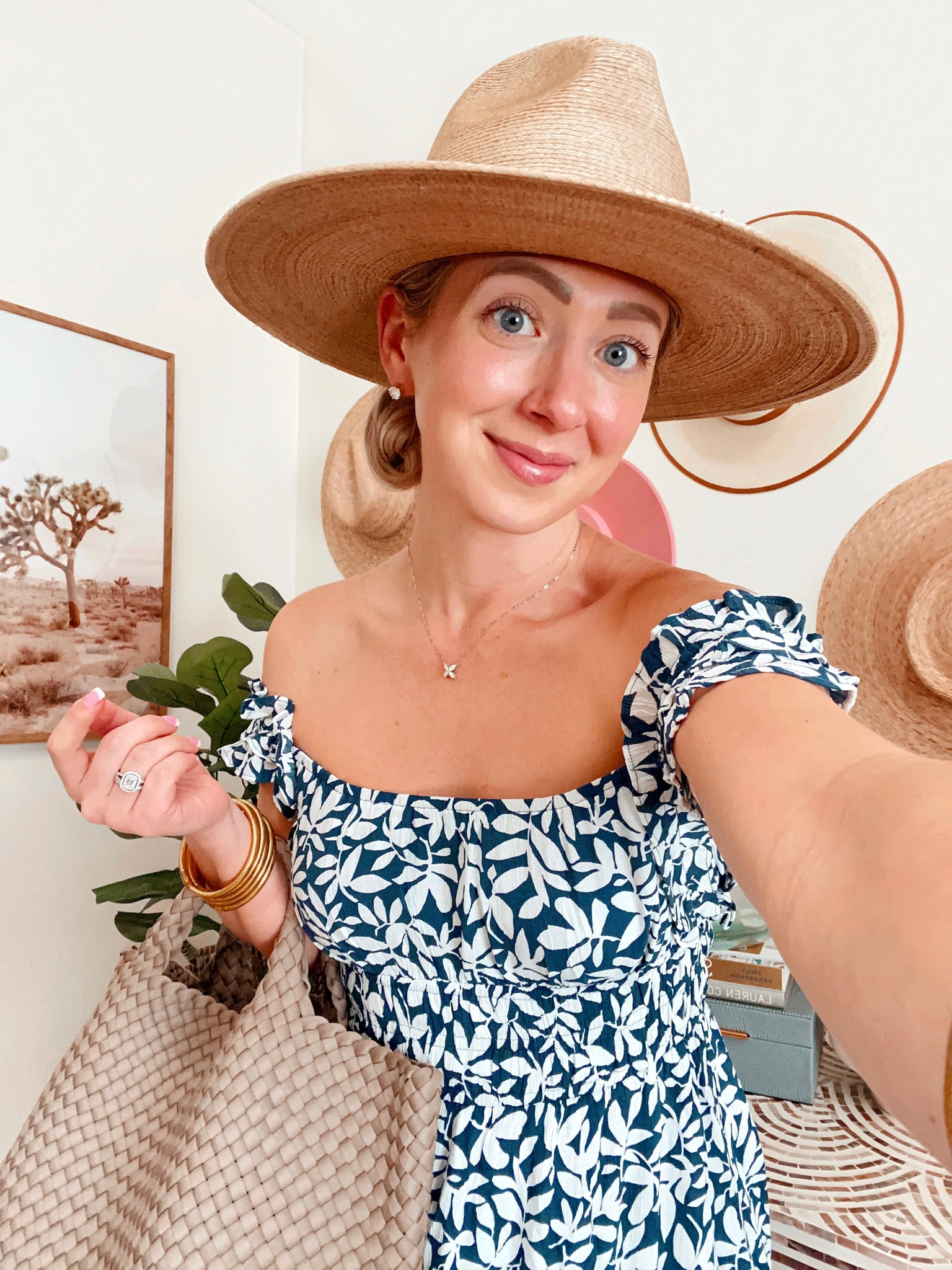 The playful floral pattern on the dress offers a fresh, springtime appeal, while the puff sleeves add a touch of feminine charm. The wide-brimmed hat not only serves as a stylish accessory but also frames the face beautifully, creating an elegant, cohesive look.