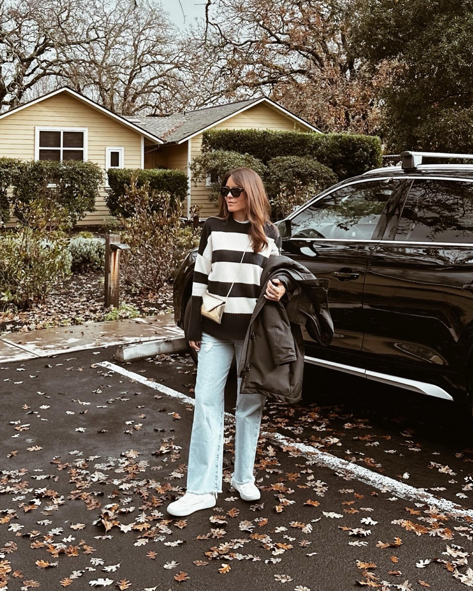 This ensemble masterfully blends classic and casual elements; the bold stripes make a strong visual statement while the relaxed fit jeans add a touch of effortless chic. The layered jacket and sunglasses inject a polished, urban edge to the look, perfectly balancing comfort with style.