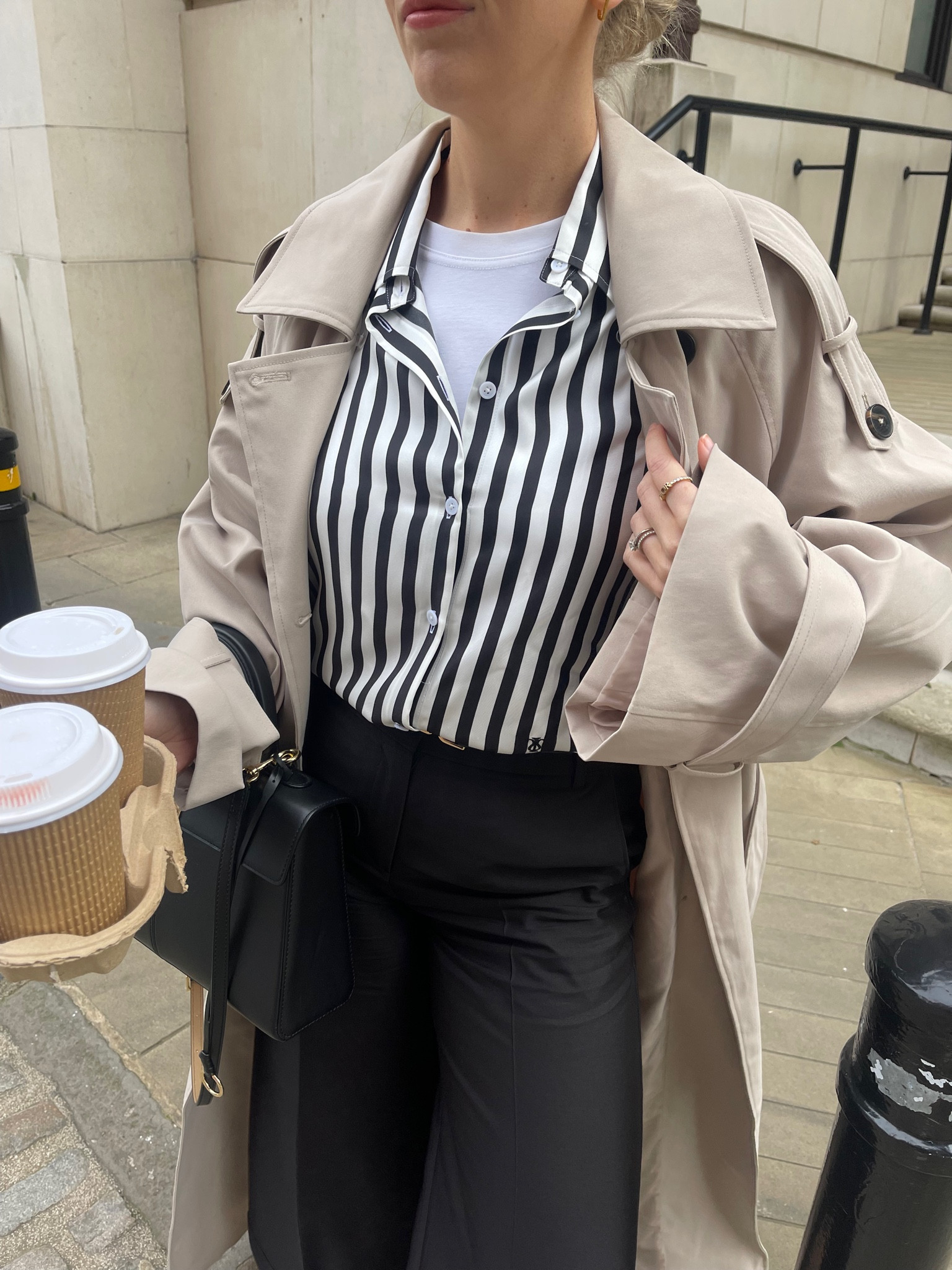 The classic vertical striped shirt creates a flattering, elongating effect, perfectly balanced by the effortless sophistication of the tailored trench. The monochromatic palette exudes a chic, timeless vibe, while the structured black trousers and subtle accessories underscore an aura of urban elegance.