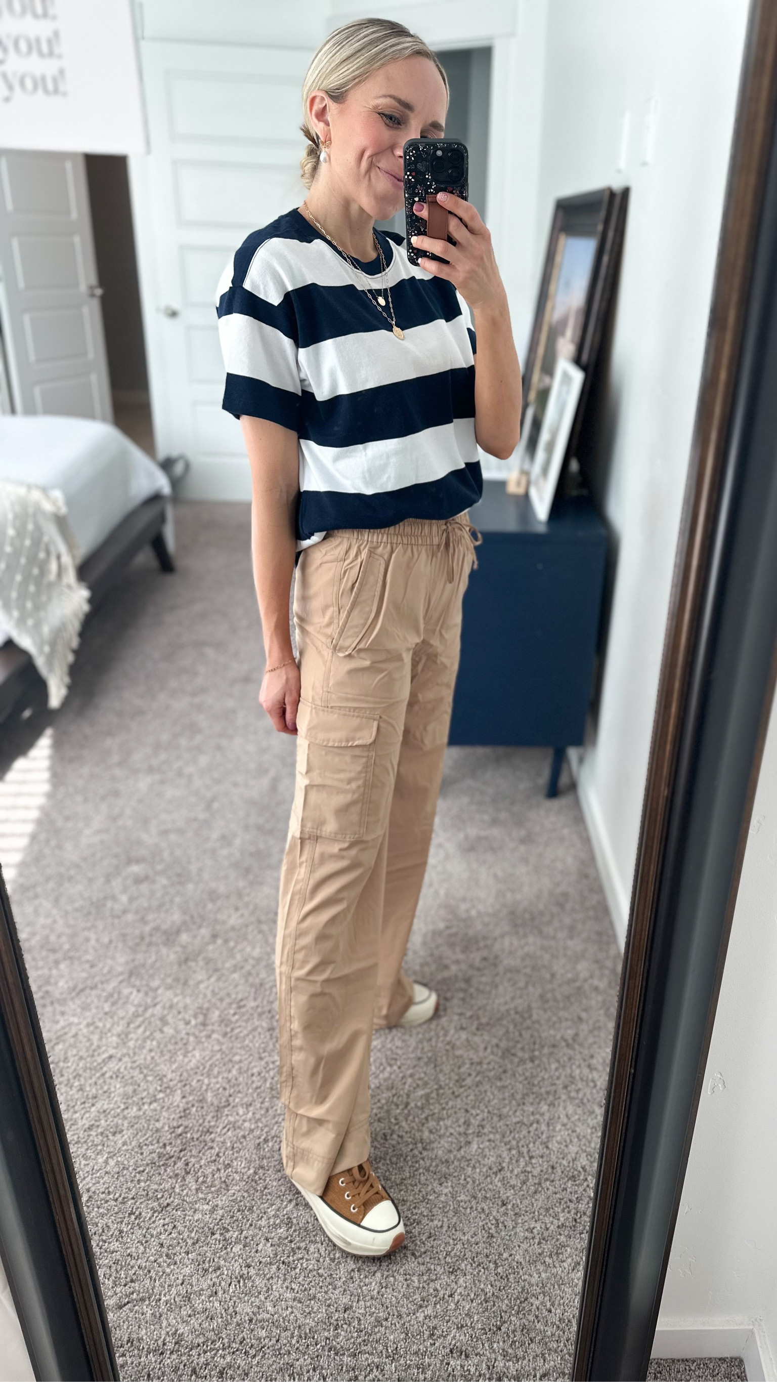 The combination of horizontal stripes on the top introduces a classic, nautical flair that is timeless, while the relaxed fit of the khaki trousers offers a comfortable yet chic silhouette. The ensemble is grounded by the choice of white sneakers with a hint of color, giving off a casual, effortlessly stylish vibe.