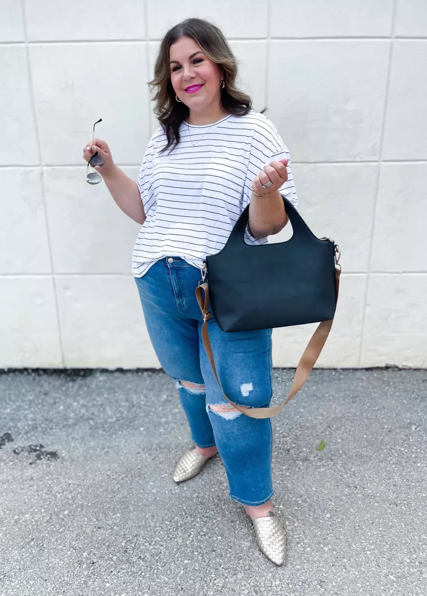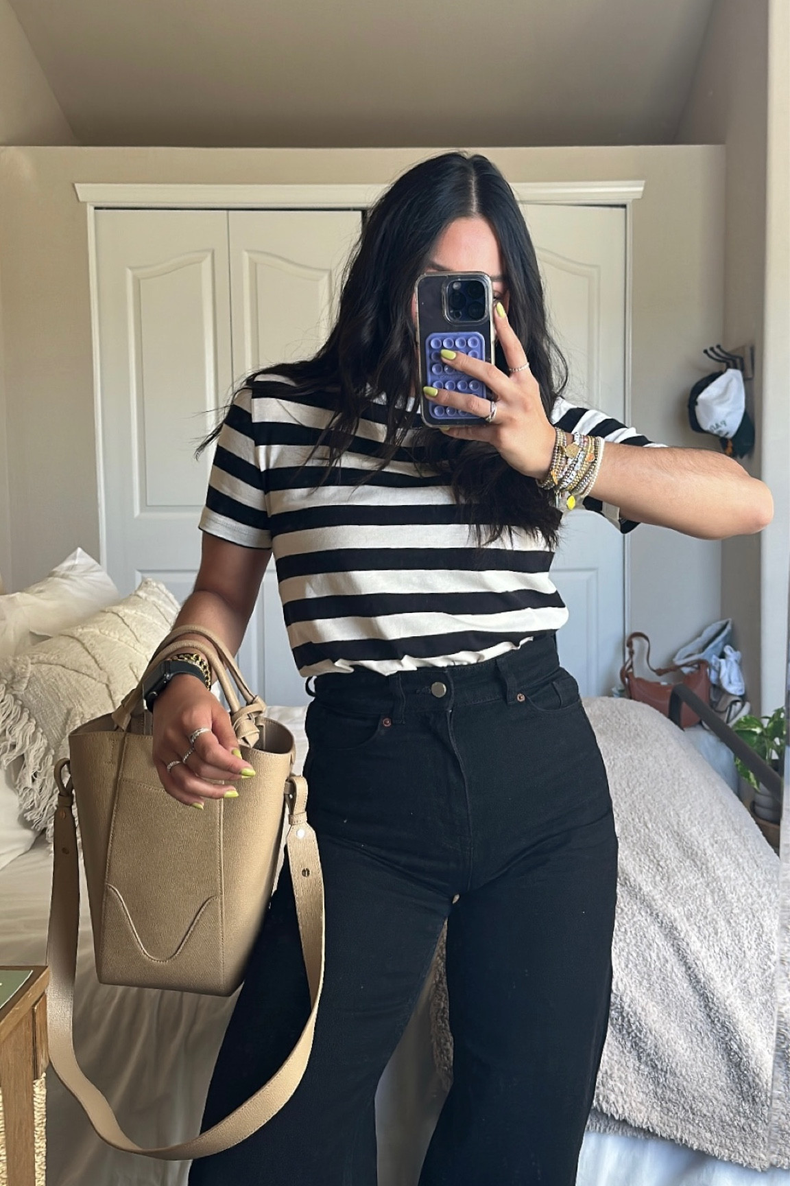The classic black and white striped tee offers a timeless look, while the high-waisted black jeans provide a flattering silhouette. The tan accessories add a perfect neutral pop, tying the ensemble together elegantly.