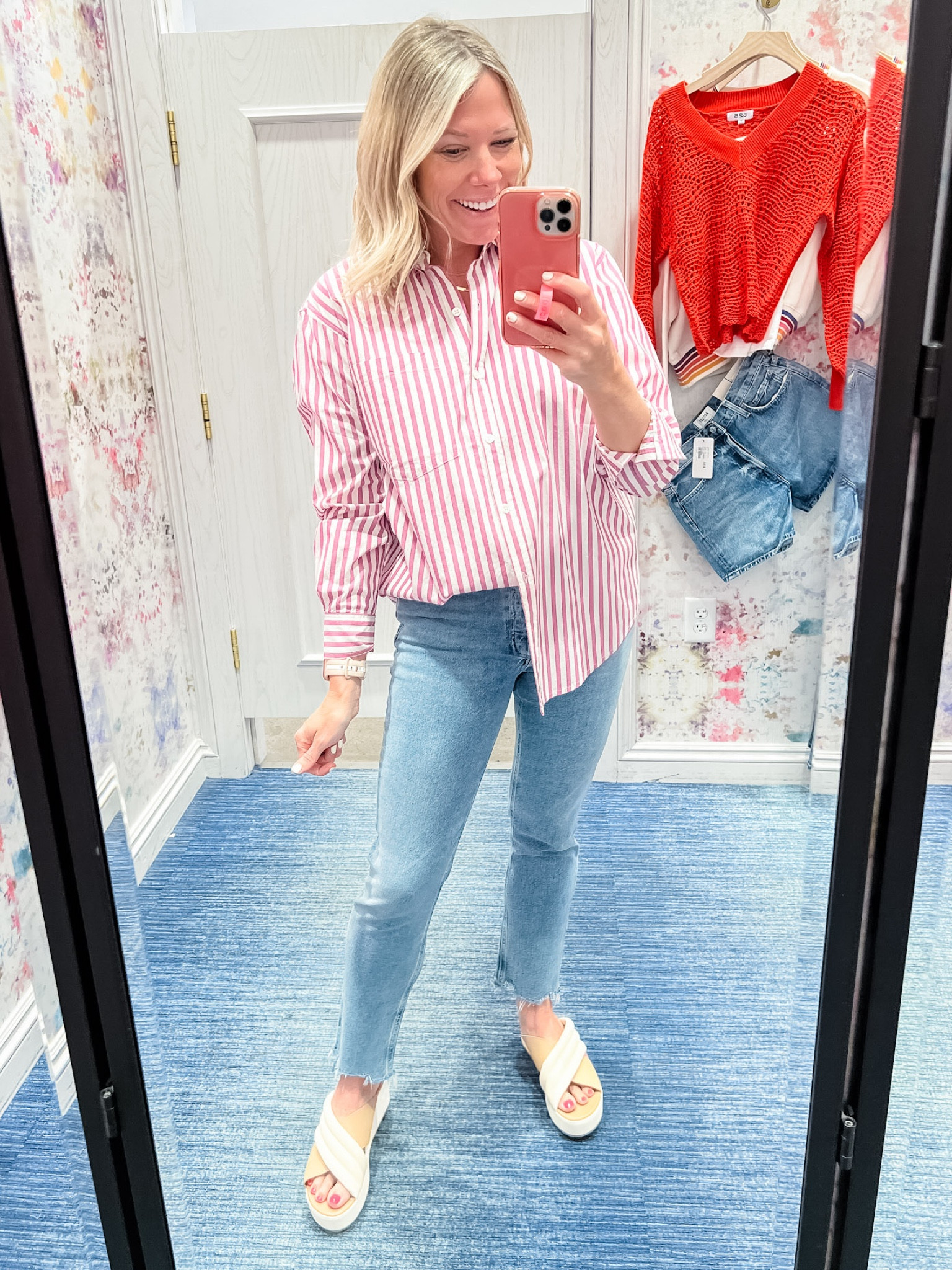 The classic red-striped button-down shirt offers a crisp, timeless look paired smartly with casual light-wash denim, striking a balance between comfort and style. The subtle front-tuck accentuates the waist, while white slide sandals add a trendy, laid-back touch, perfect for a relaxed yet chic ensemble.