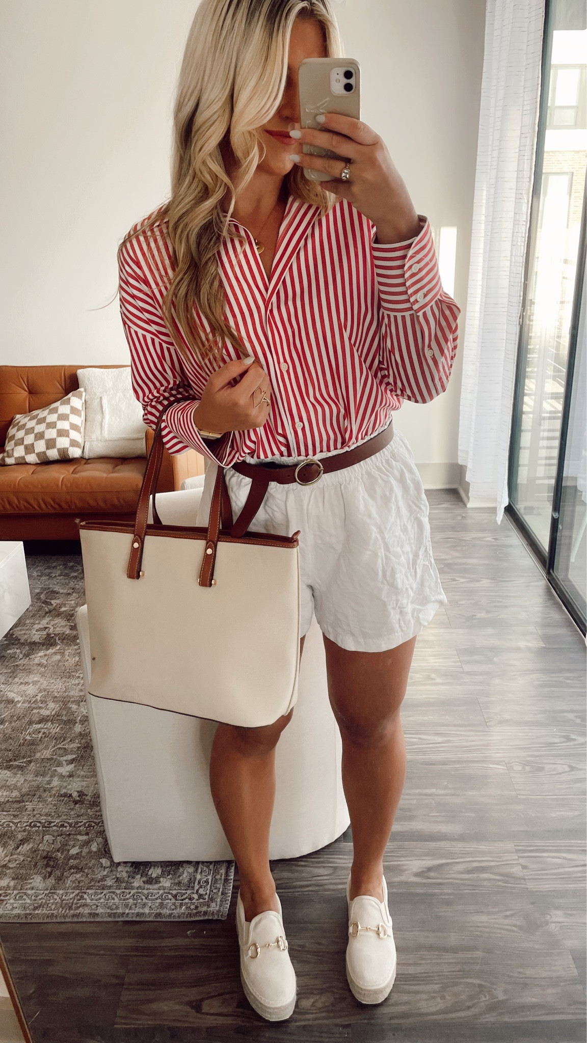 The bold red-striped blouse provides a striking contrast against the crisp white shorts, creating a fresh and eye-catching ensemble. The coordinated white accessories, including the loafers and tote, pull the look together for a chic and polished effect.