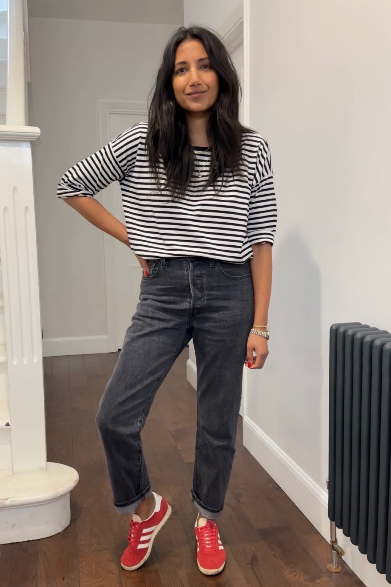 The classic black and white striped top offers a timeless look, while the relaxed fit of the jeans adds a modern, casual vibe. The pop of red in the sneakers serves as a fun and youthful touch that also brings the whole ensemble together nicely.
